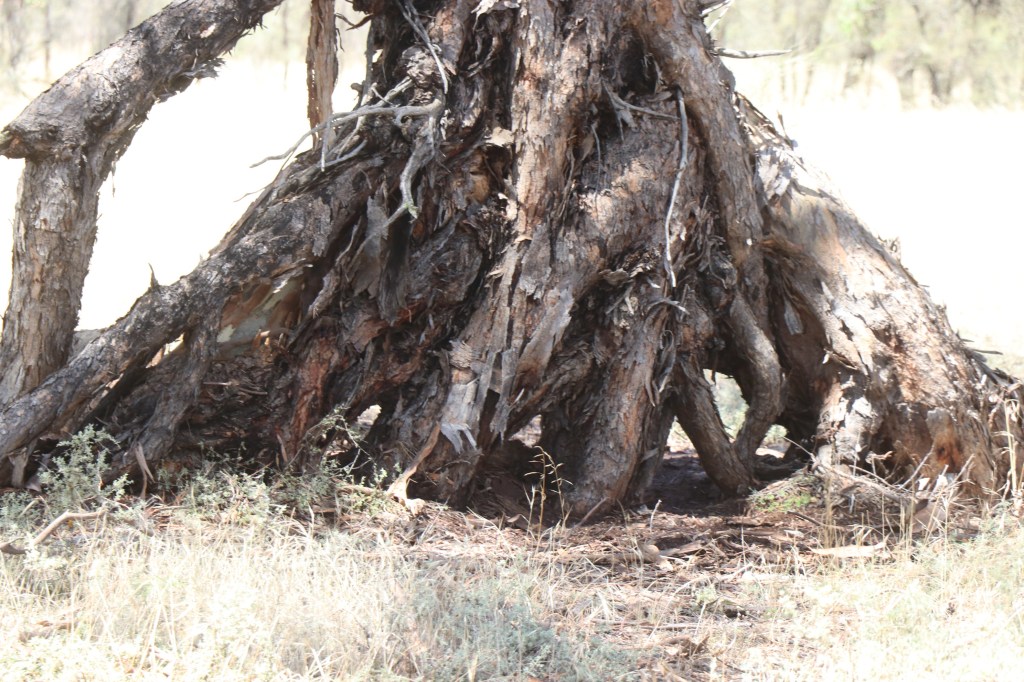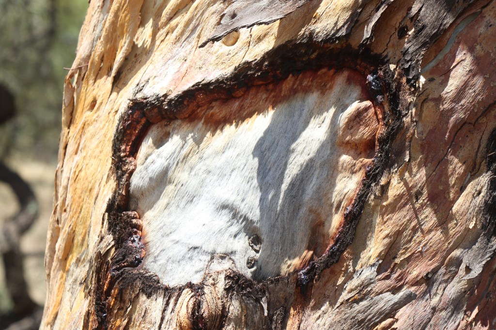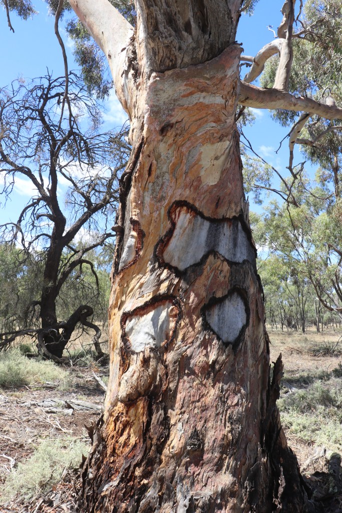 I am surprised and disappointed I have not found an Aboriginal scar tree but I do come across a tree bearing some beautiful scars. Large chunks of bark have disappeared in circles which is possibly the work of an insect.