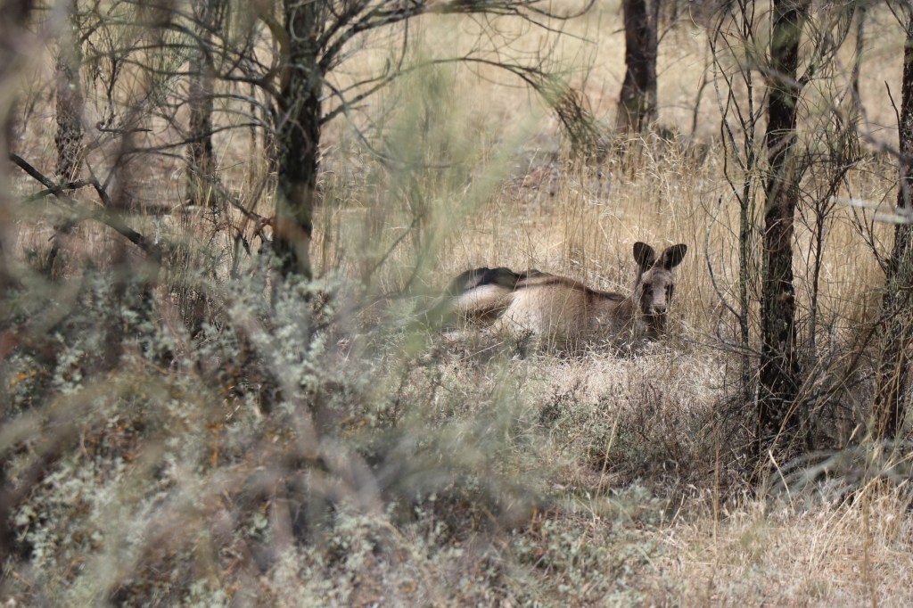 The kangaroos are a different story. They have had their afternoon slumbers disturbed by my footsteps and are casually bouncing off to the next clump of trees. I must not appear too scary for I soon find one lying in the shade and oblivious to my gentle approach.