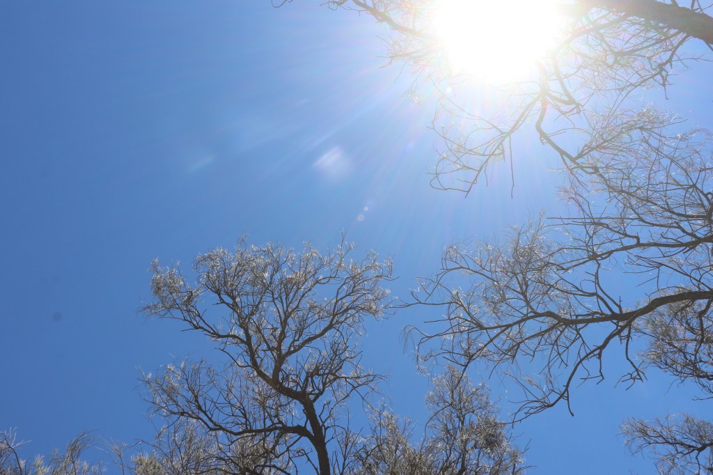 The noises continue as I hear the next lot of trees – a stand of singing bulokes. With their gnarly black trunks and skinny branches and leaves they are not the most buxom of vocalists but they have good sets of lungs no less. Known as the windharps of the Wimmera they collectively harmonise an eerie song from whatever breeze is passing. Mesmerised I decide to lie and listen and look at the trees and sun above. A fly lands virtually on my camera and is captured forever.