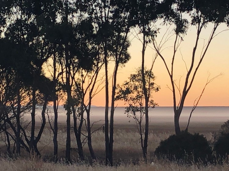 Just past the bridge at Quantong a thin layer of cloud rises just above the stubble and crops on our right and left.