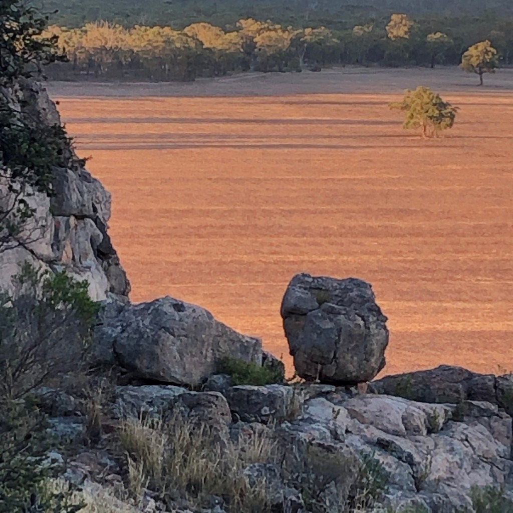 Today I discover it is pretty amazing at dawn too. We get out best view of Arapiles or Dyuritte for the day, with well shaded crop circles of recently ploughed paddocks in the foreground and our rock bathed in sunlight to the rear.