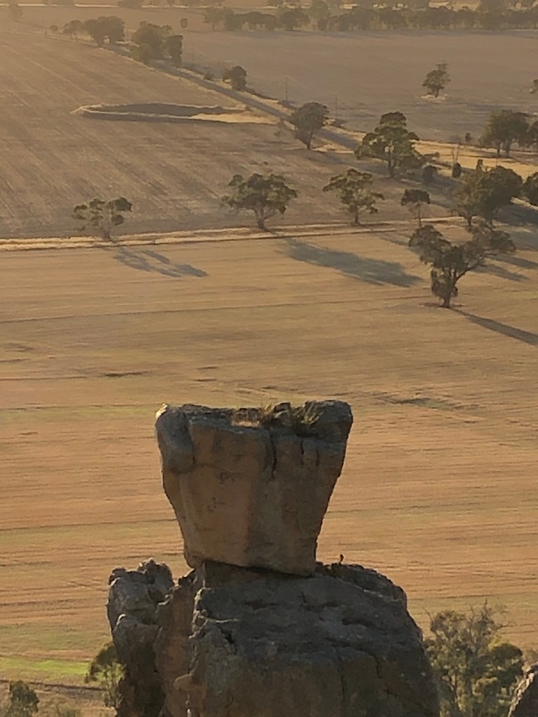One amazing rock sits absurdly like a flower pot carefully placed for photo opportunities. Beyond Mitre itself is just a burst of beautiful soft light amidst a misty vista of the Gariwerd Grampians and Black Range State Park in the background with a sea trees littered across the cream paddocks. Just awesome.
