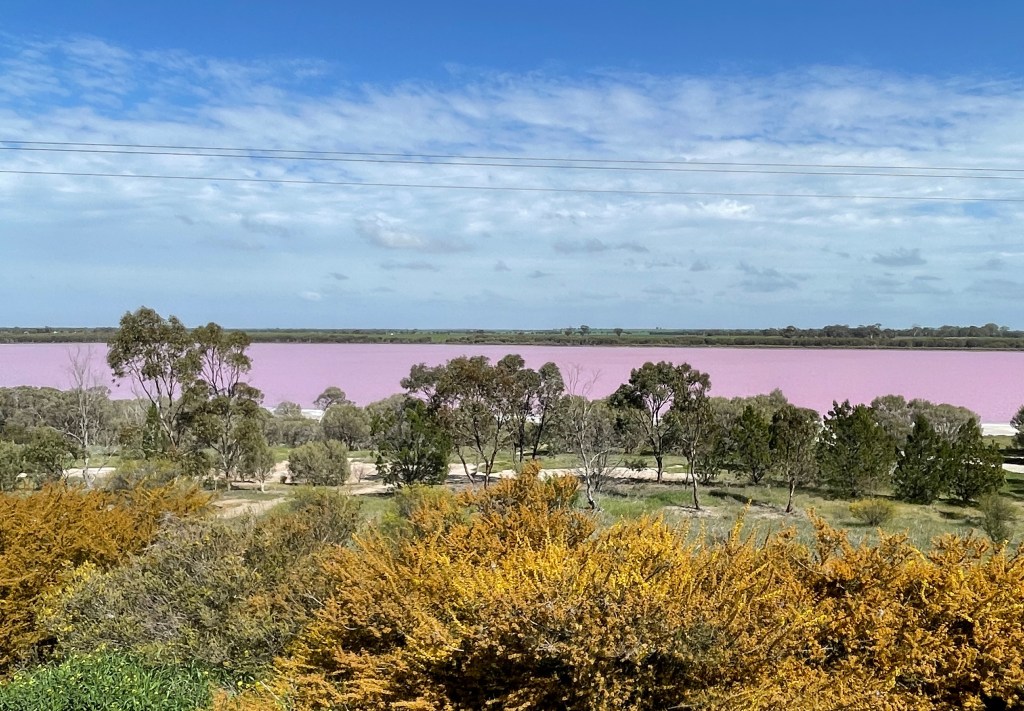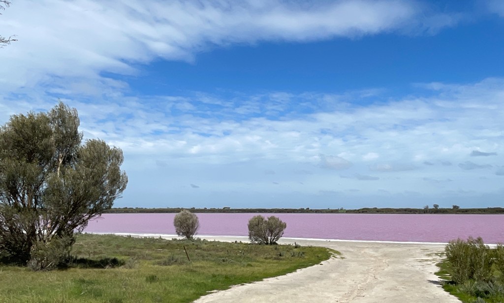 The 45ha salt lake sits just off the highway about 10km west of Dimboola and has gained social media notoriety after passing travellers photographed it looking particularly pretty in pink