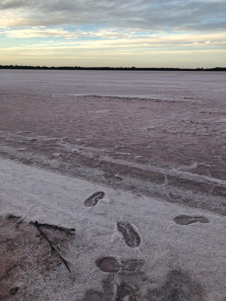 Interestingly the lake’s edge is grey clay and it appears the local kangaroos have almost been bogged in its sticky depths. Their usual thin spiky prints are several centimetres deep in some spots.