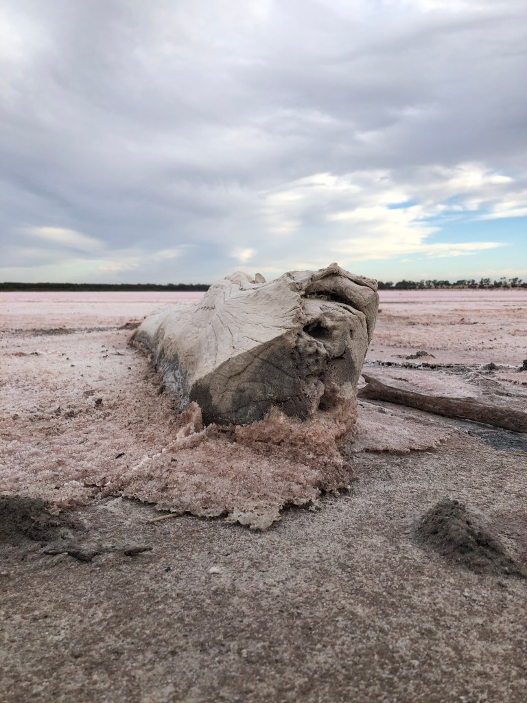 In places the salt sits in curved layers along the shoreline, like a receding wave. Something hard to comprehend when there is no water.