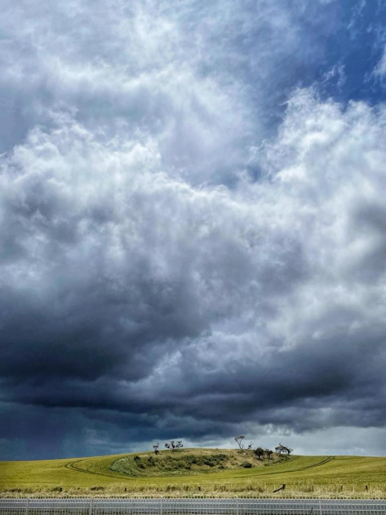 Dark splats among the lines remind me of a John Olsen painting –another artist beguiled by Wimmera’s big skies and landscape.