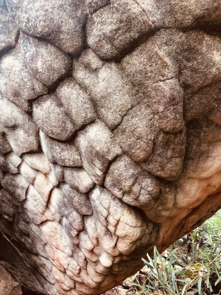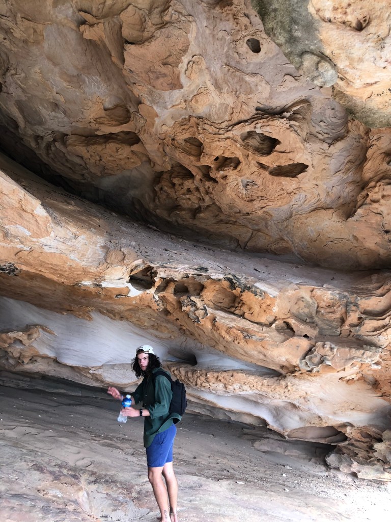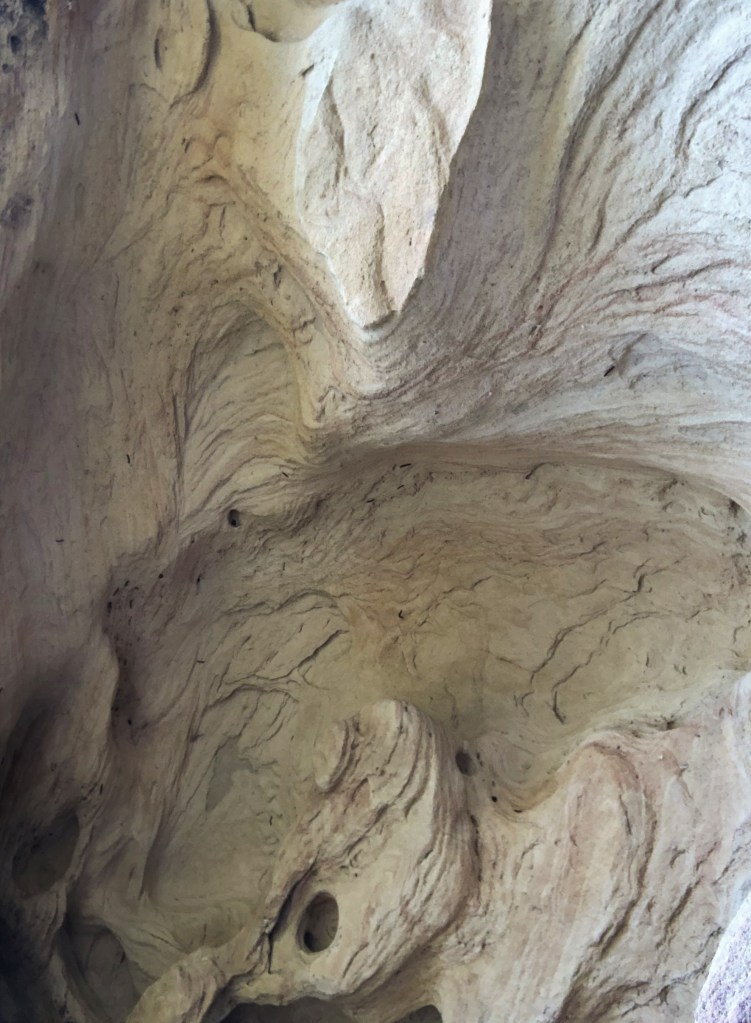 We take a closer look at the rock shelter with its weathered holes, muted ochre and wheat coloured tones and notice another rock we had passed on the way up that looks a lot like a brain.