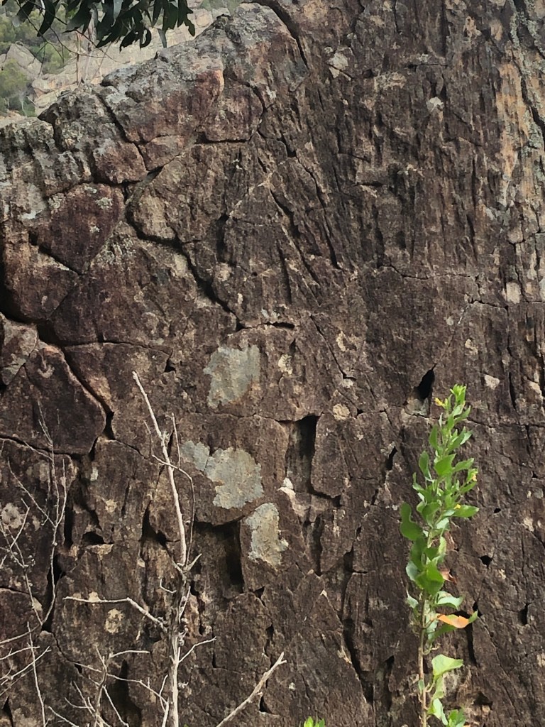 The track follows the edge of another wall of rock and at ground level random boulders covered in many lines and holes are scattered among the trees.