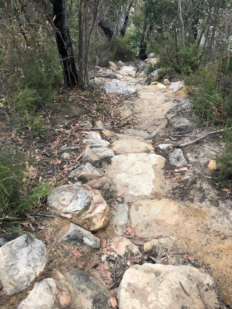 The path weaves around some more boulders and past rock shelters and then emerges onto the ledge directly above the Taipan Wall area.