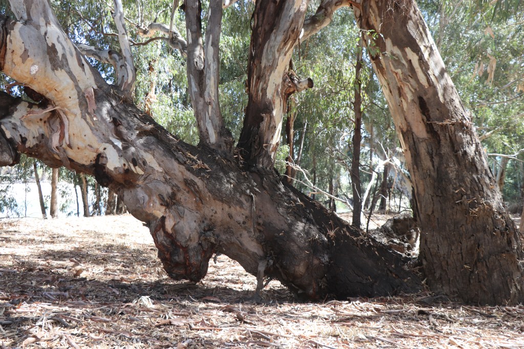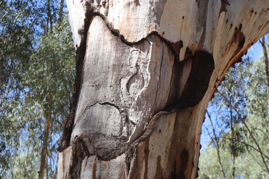 One tree looks like it’s pants have fallen down as a fat burl bursts from the trunk about a metre above the ground. Others bear scars which could well have been made long before Ned and the sheep arrived. What stories they could tell of the past few 100 years!