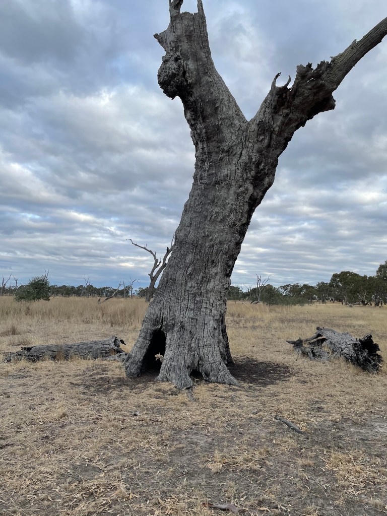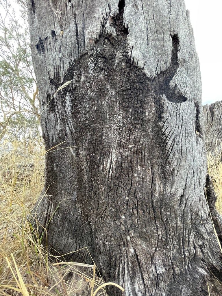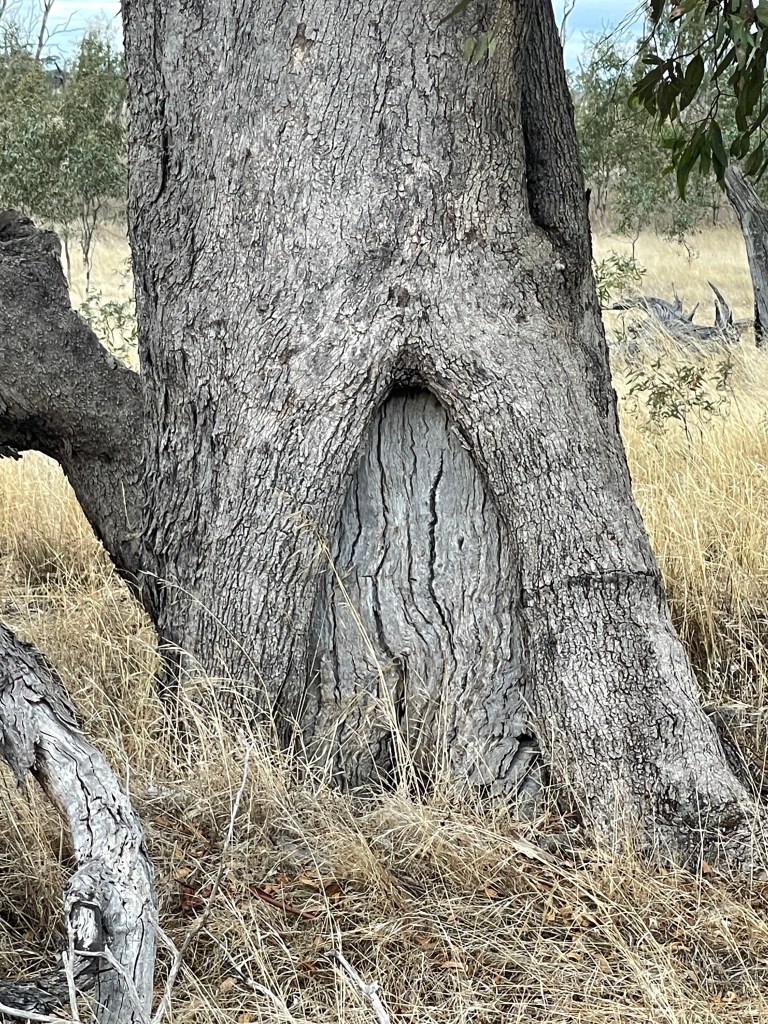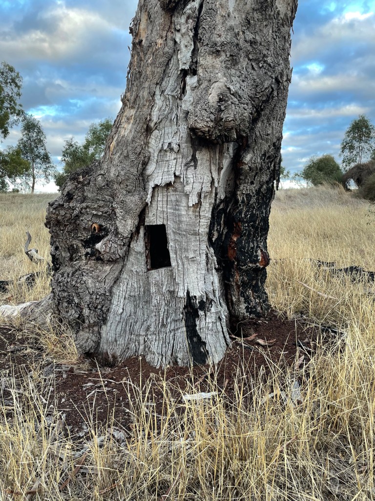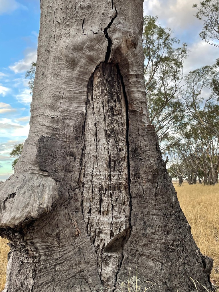 I pass some veteran red gums including a burned hollow trunk which may have also been scarred by a human hand in a long distant past. It is right near a dry creek that feeds the swamp after a downpour.