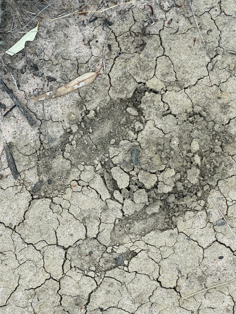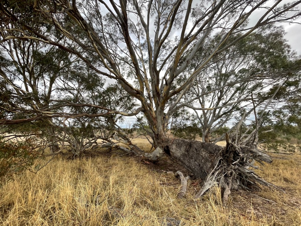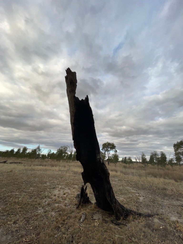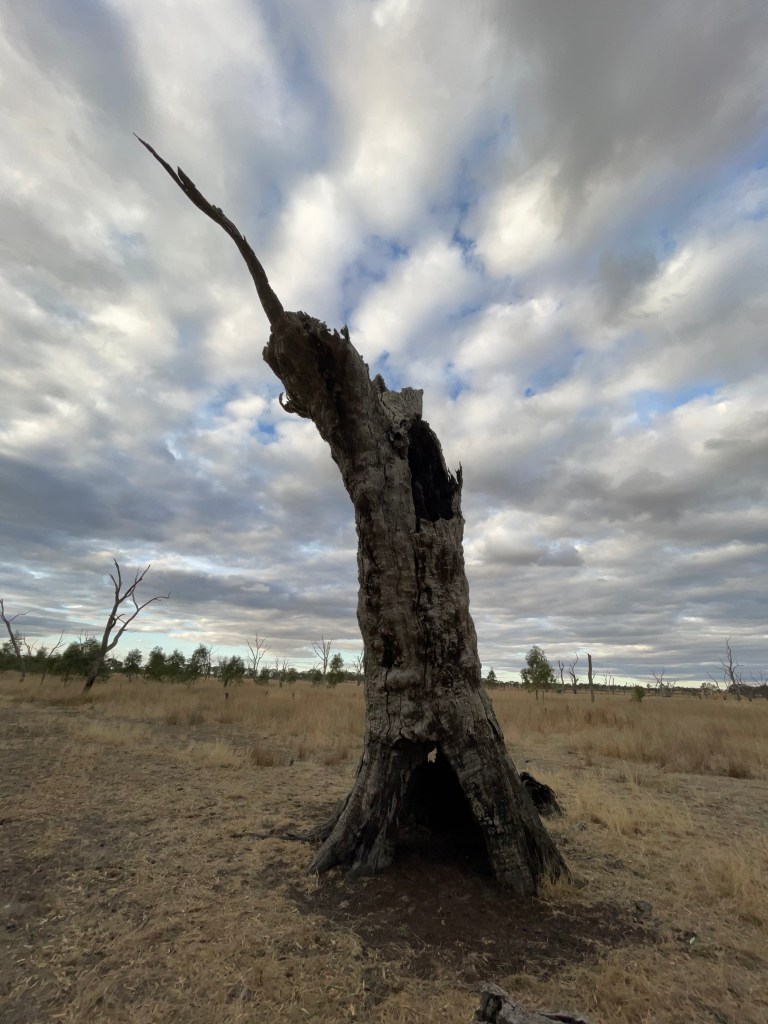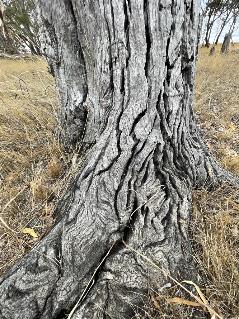 I pass some veteran red gums including a burned hollow trunk which may have also been scarred by a human hand in a long distant past. It is right near a dry creek that feeds the swamp after a downpour.