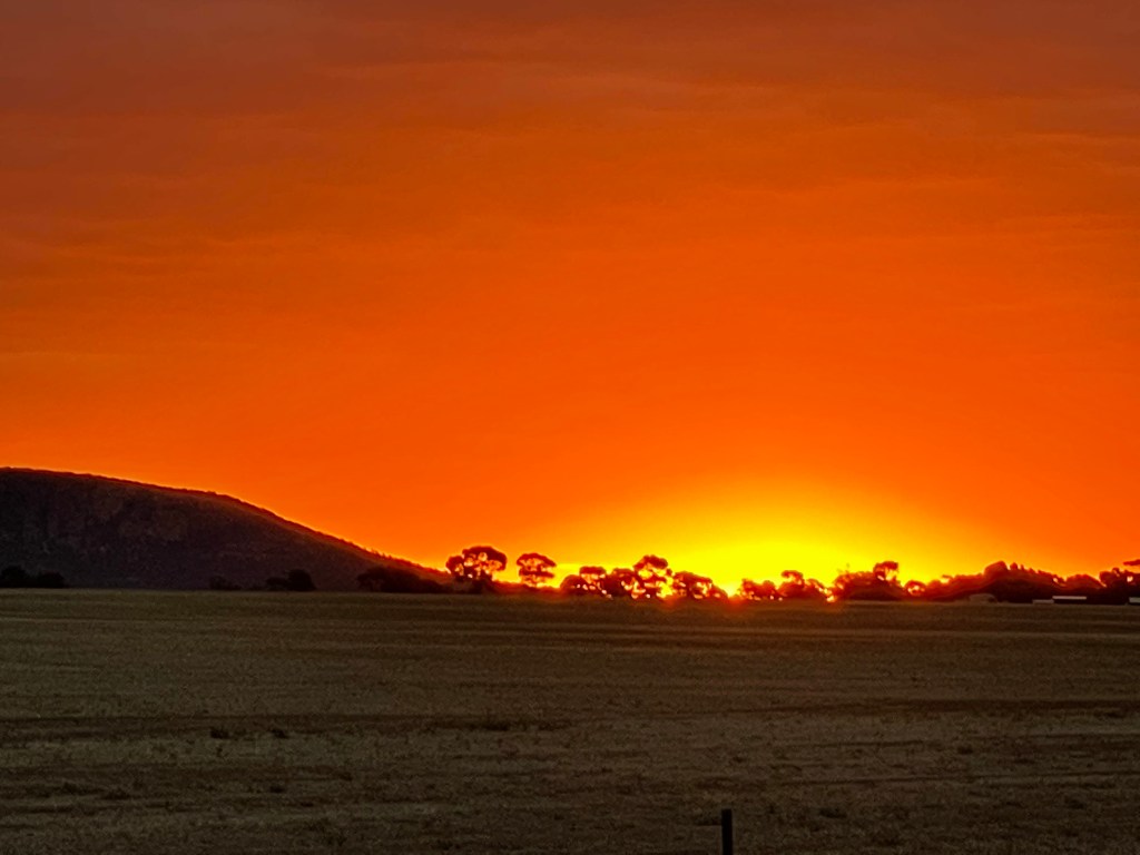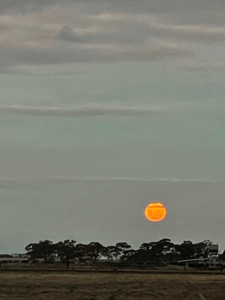 The sky puts on a brilliant orange sunset at Arapiles on drive back to Horsham and the moon smiles down over Quantong