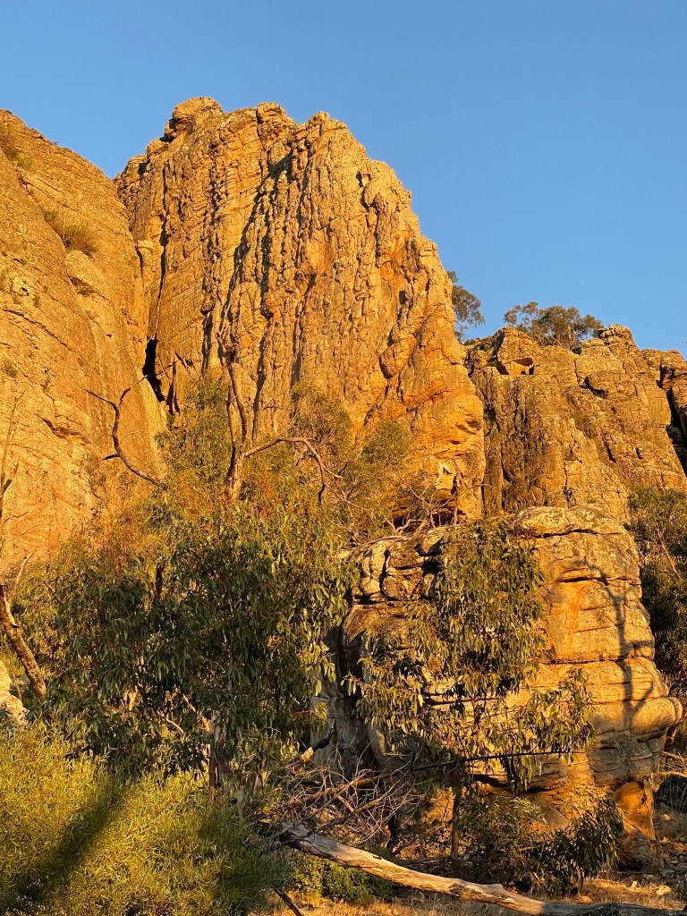 The 2020 Greater Gariwerd Landscape Draft Management Plan lists both artefact sites and rock art at this reserve and rock climbing is currently banned but we found no restrictions on following the walking path to the top.