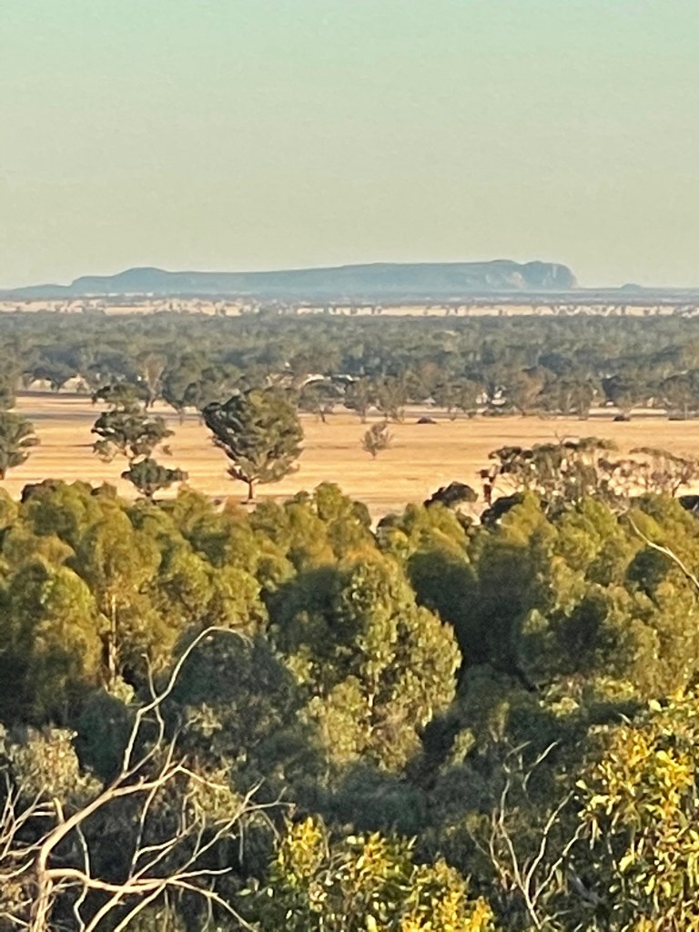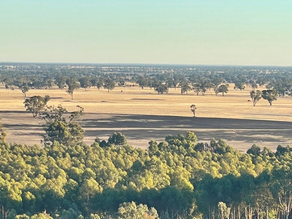 Instead of a sea of cropping paddocks we see Gariwerd to the distant east, denim-coloured peaks of Burrunj (Black Range) spreading across the southern landscape and to the north – the smaller mounds of Lil Lil (Red Rock).