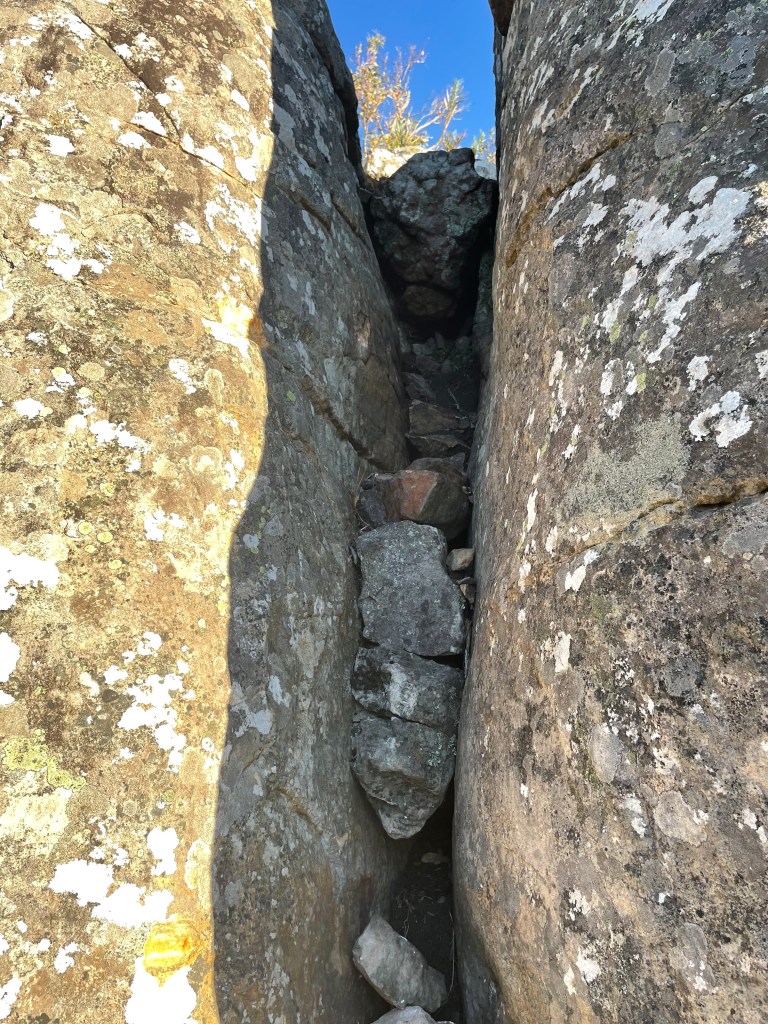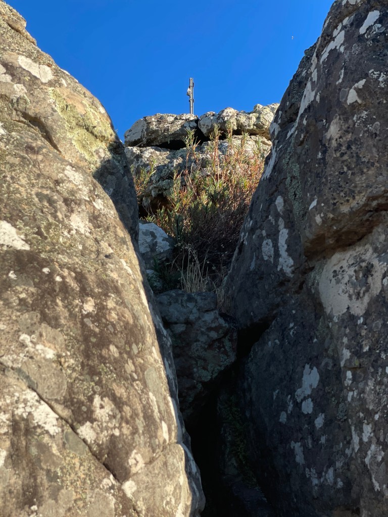 The highest point alludes us because we’d need to climb rocks to get to the top. There are remnants of former hand holds that may have been installed back in the 1980s and have since decayed.