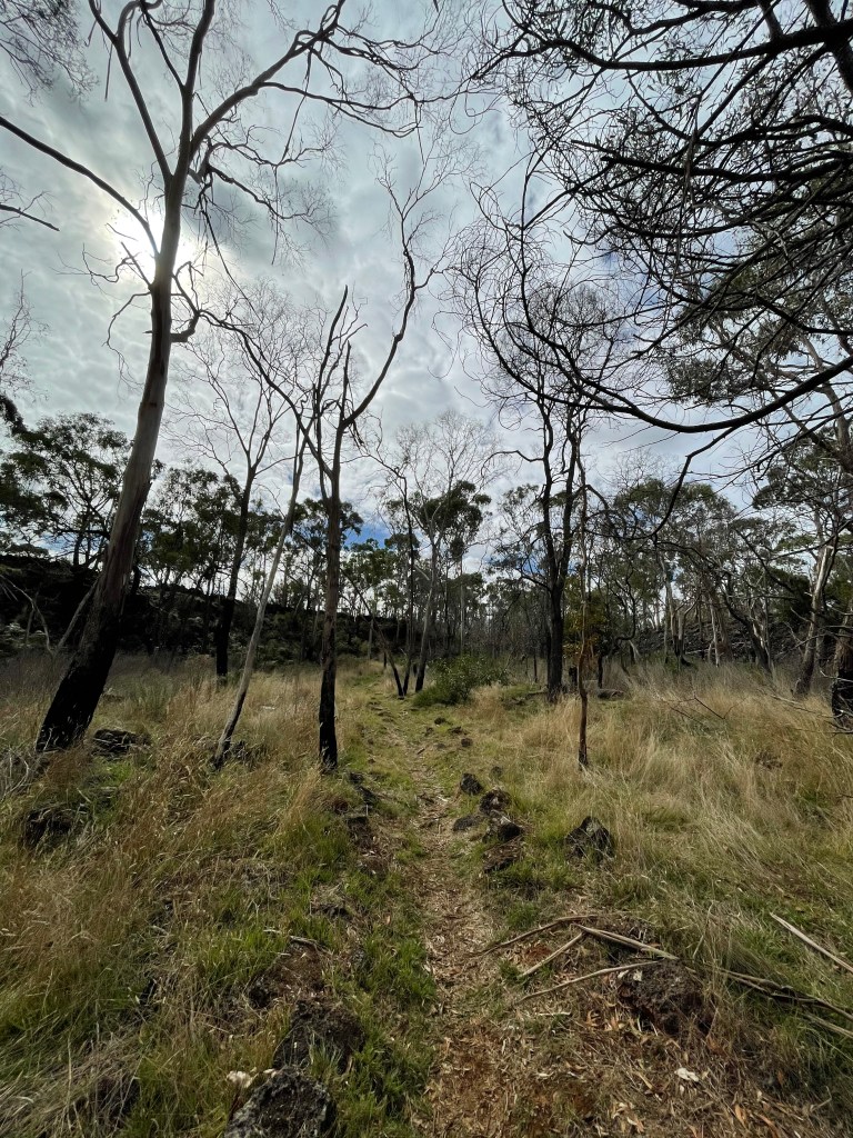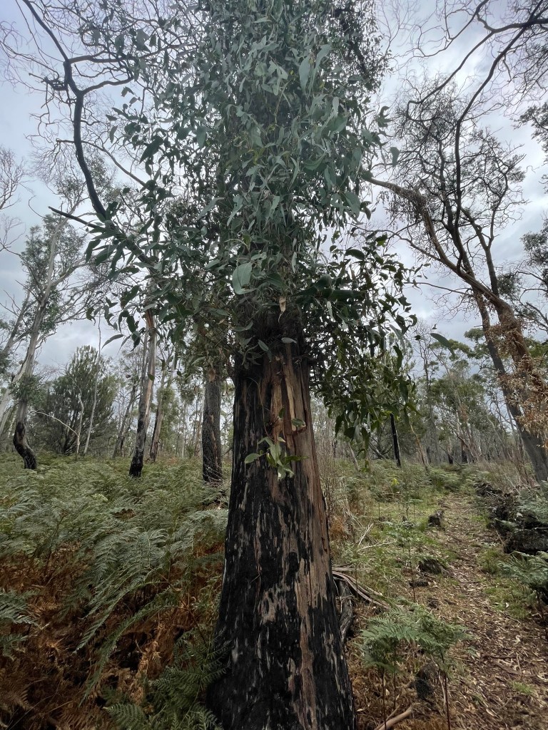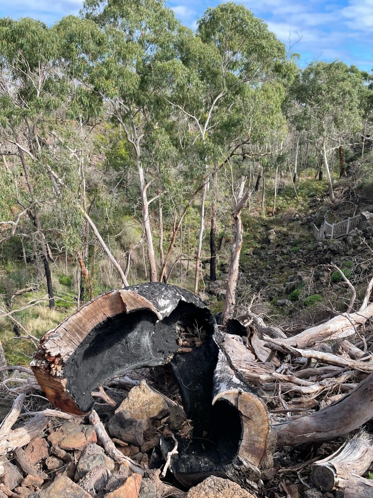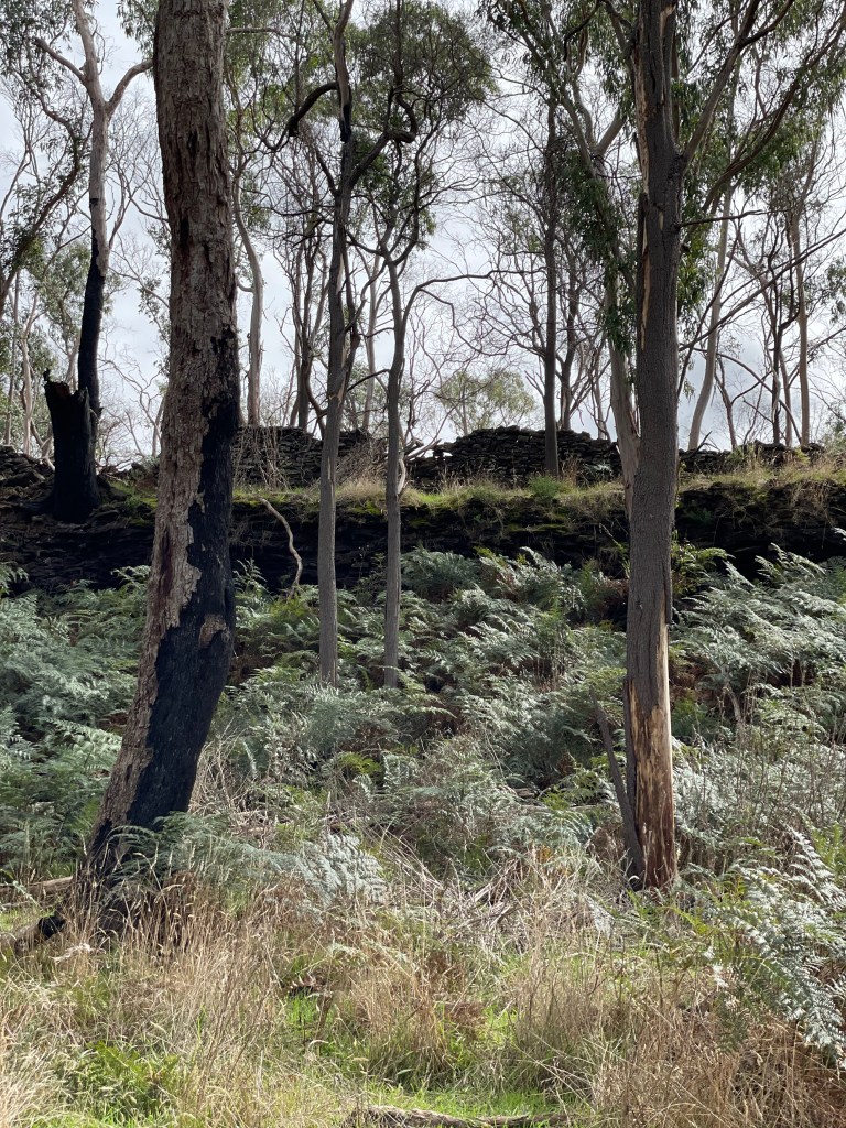 You start to get a real sense of the fire’s impact. Lush bush is replaced by a mess of grey and blackened limbs which stretch as far as the eye can see. Sooty tree trunks resemble tyre tread while others are caste on the ground, with roots defiantly clutching rocks and soil.