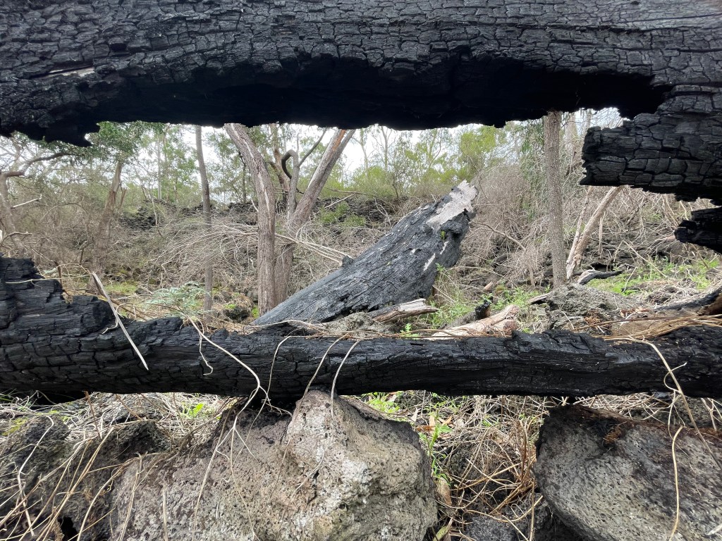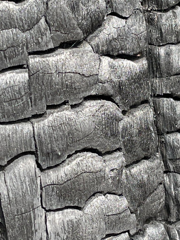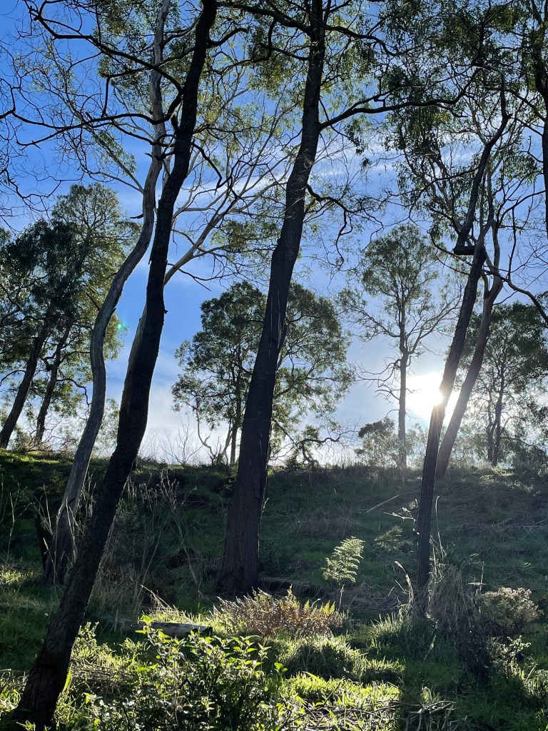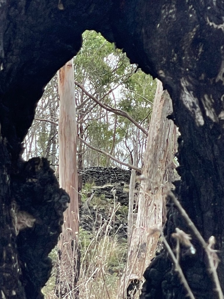 You start to get a real sense of the fire’s impact. Lush bush is replaced by a mess of grey and blackened limbs which stretch as far as the eye can see. Sooty tree trunks resemble tyre tread while others are caste on the ground, with roots defiantly clutching rocks and soil.