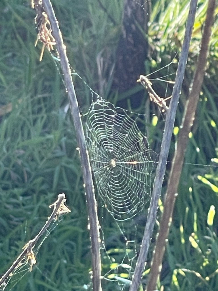 The birds are in fine song, wallaby eyes stares silently at me from behind thick braken and the morning sun spotlights tiny spiders webs.
