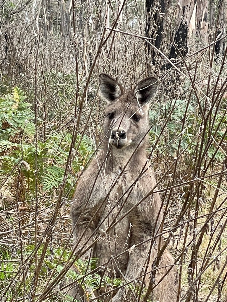 Little lizards flash across the rocks and a crack in the bracken reveals big kangaroo, virtually beside me. We say hello, he poses for a few photos and then he is off.