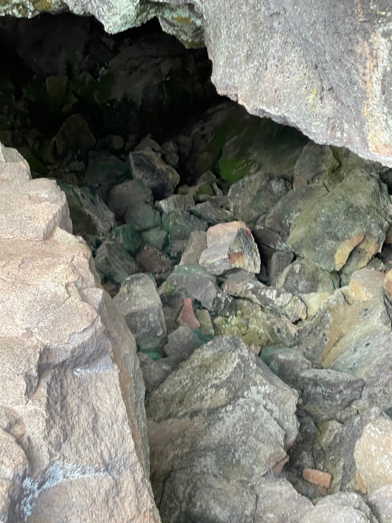 The ‘bridge’ is actually the ground covering a long skinny cave with two entries and a big pile of stones in the middle.