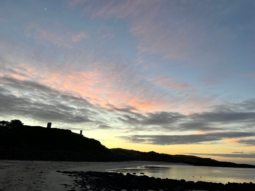 It is still dark when I roll out of bed. Outside the moon grins smugly as the austere stone church is serenaded by a choir of insomniac magpies backed up by the humming sea.