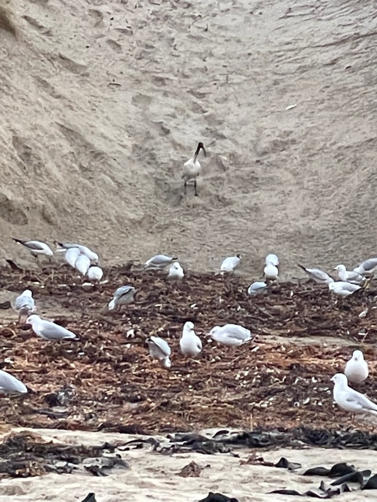 At one point I see a crowd of noisy birds busy foraging in sea weed where the dune has been attacked by waves. There is no discrimination at this feast with birds of all shapes and sizes engrossed in their sandy breakfast.
