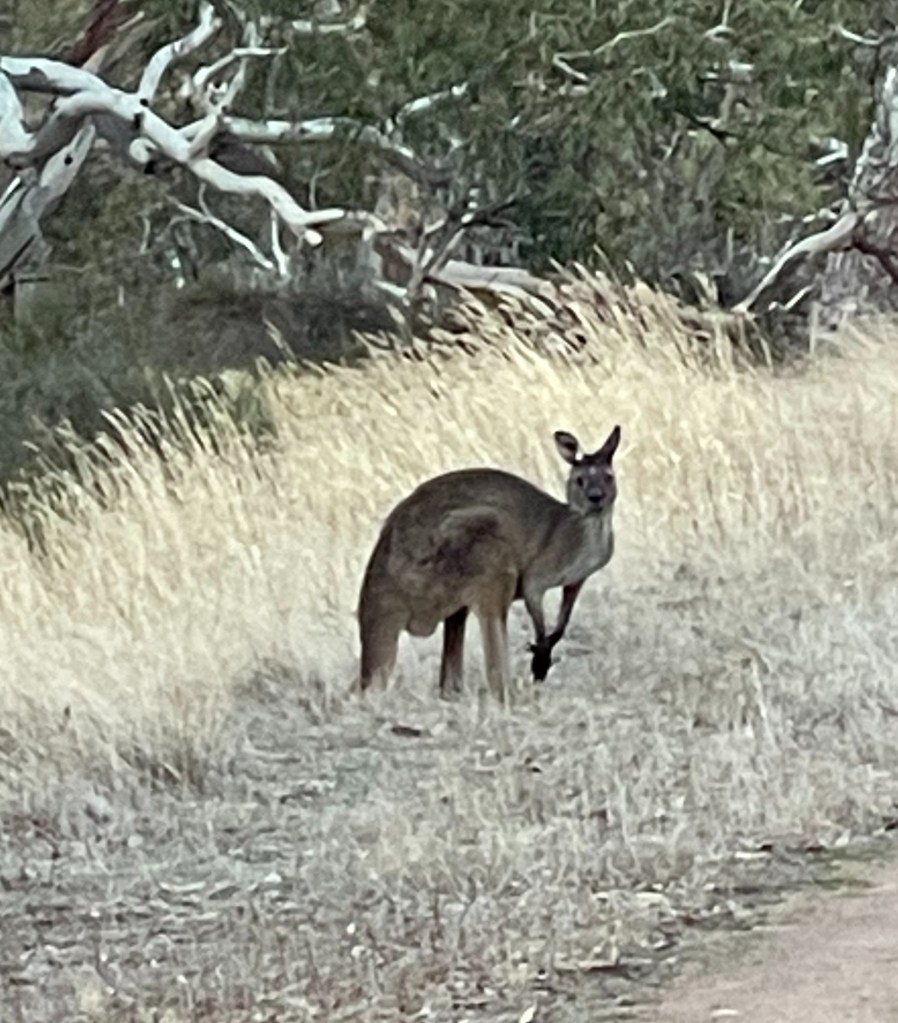 I also get pretty close to a couple of kangaroos too busy feasting by the track to notice my ridiculously loud rainbow hat.