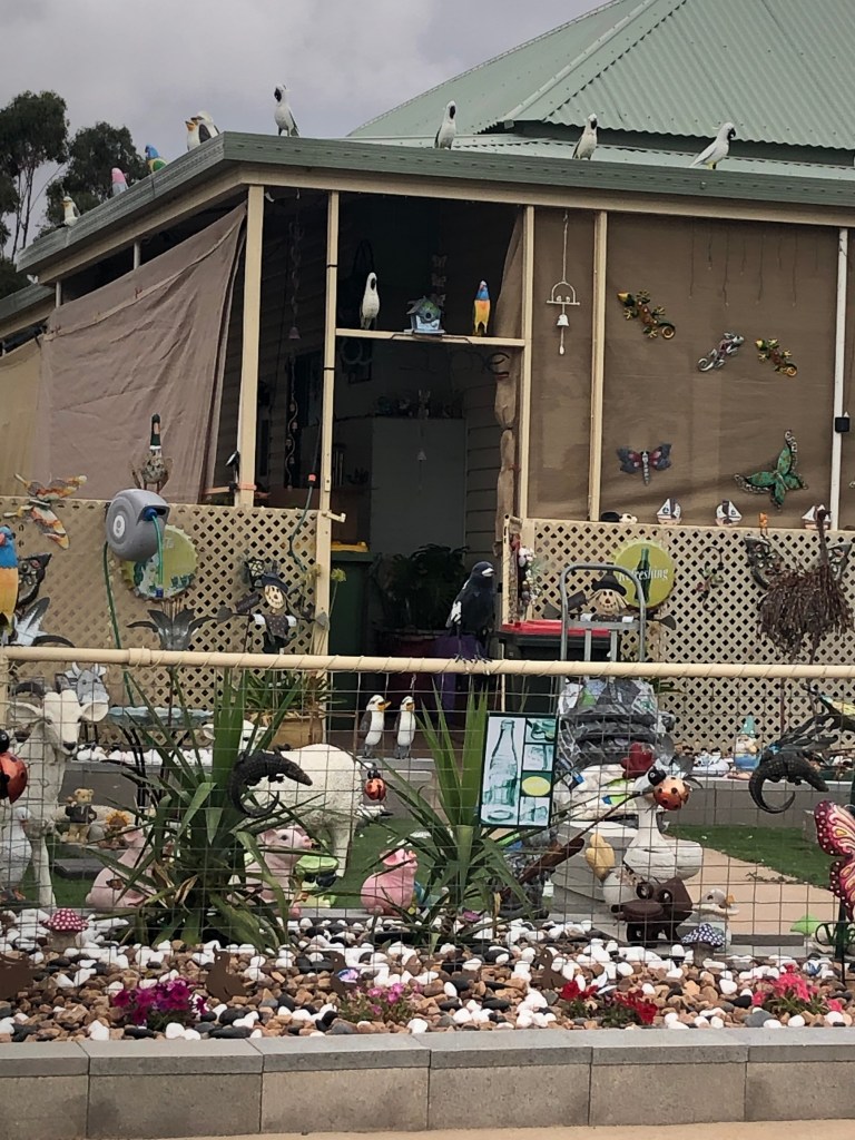 A salt lake outside Ouyen features a fake man being chased by a shark and at Underbool there’s a house with more garden decorations than a $2 shop.