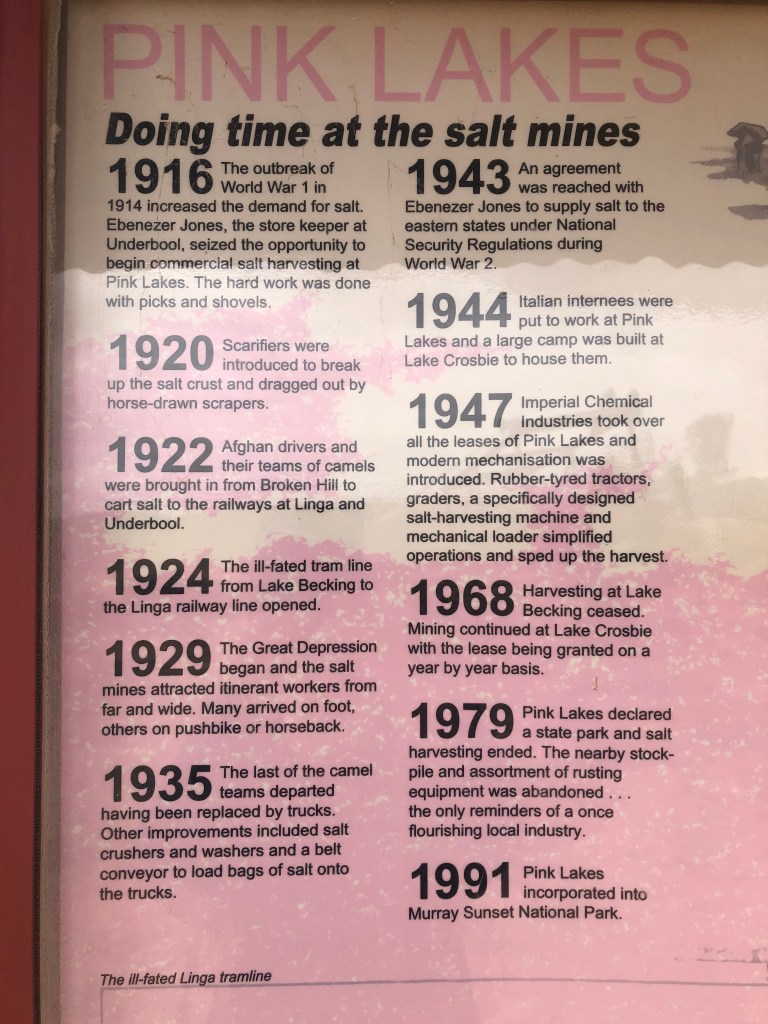 Pink Lake salt production started here during World War 1. Underbool store owner Ebenezer Jones was the man of the moment and he used a pick and shovel to harvest the salt.