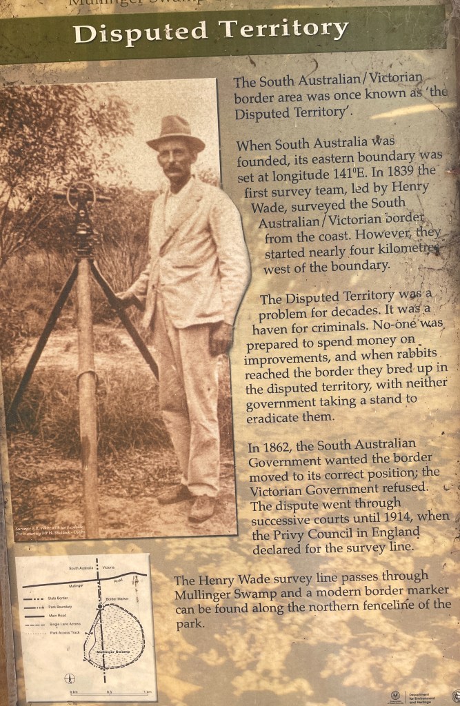 The Victorian side is called Mullinger Swamp Wildlife Reserve and the SA bit is Mullinger Swamp Conservation Park. And yes, there are two signs.