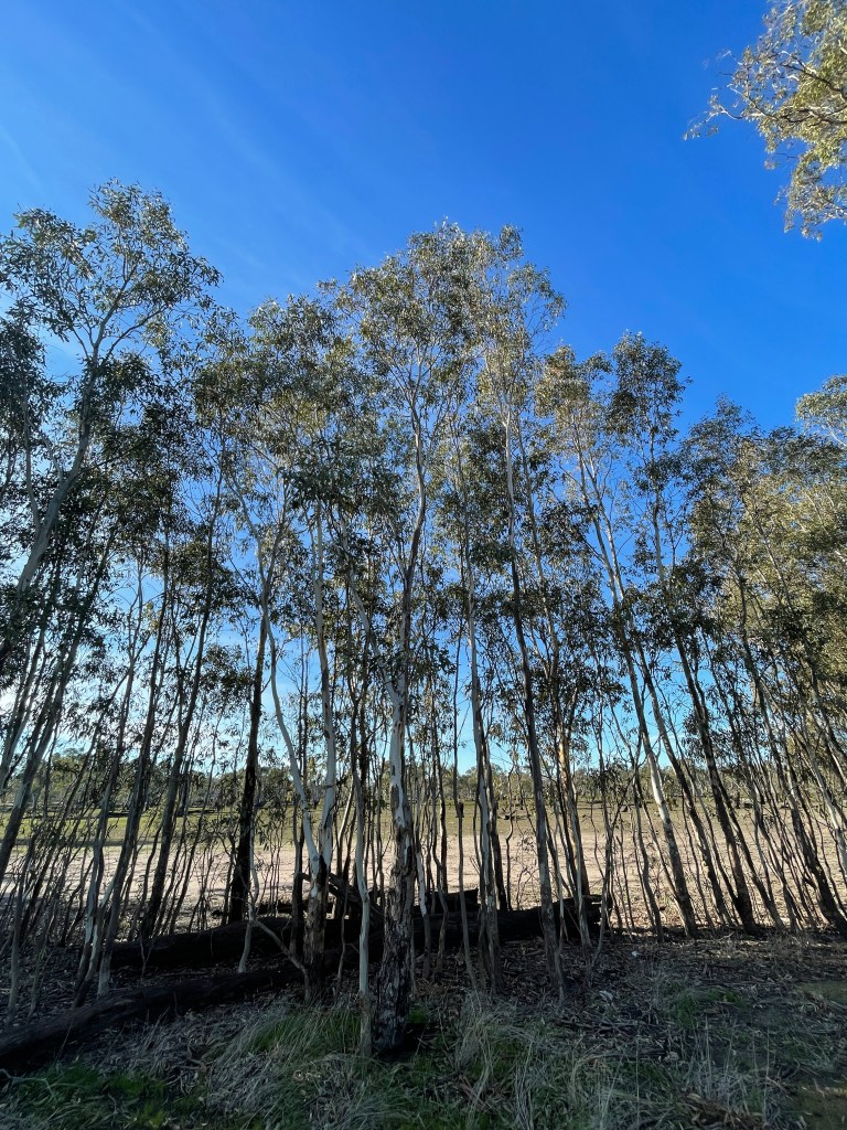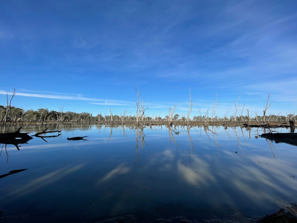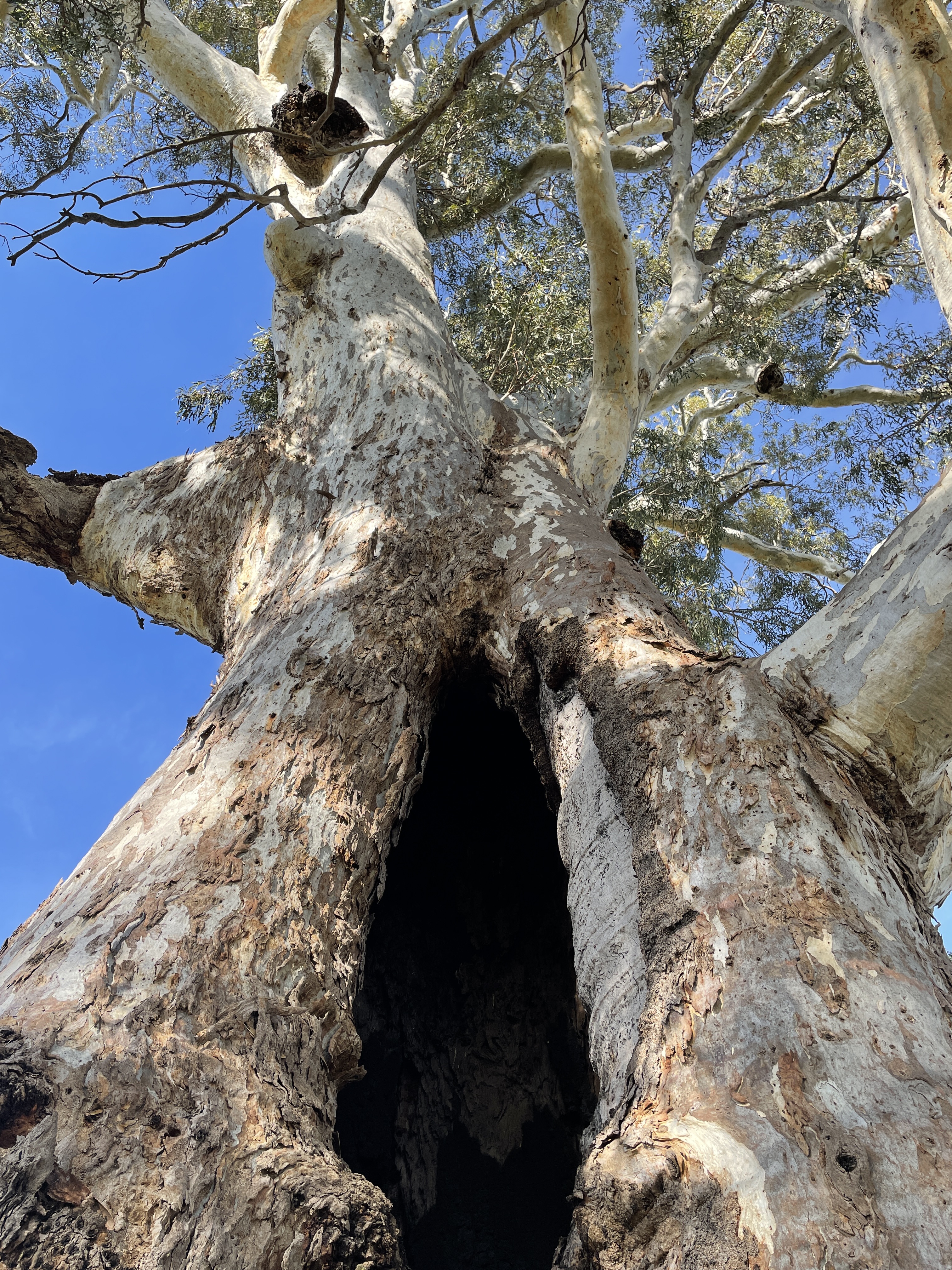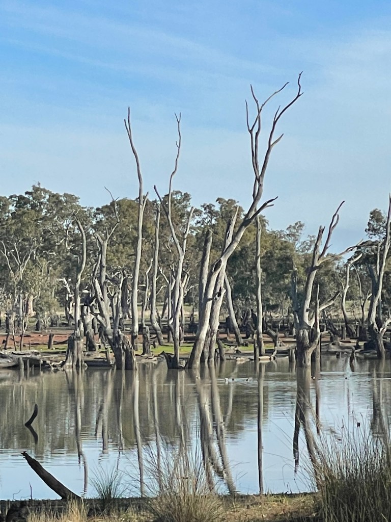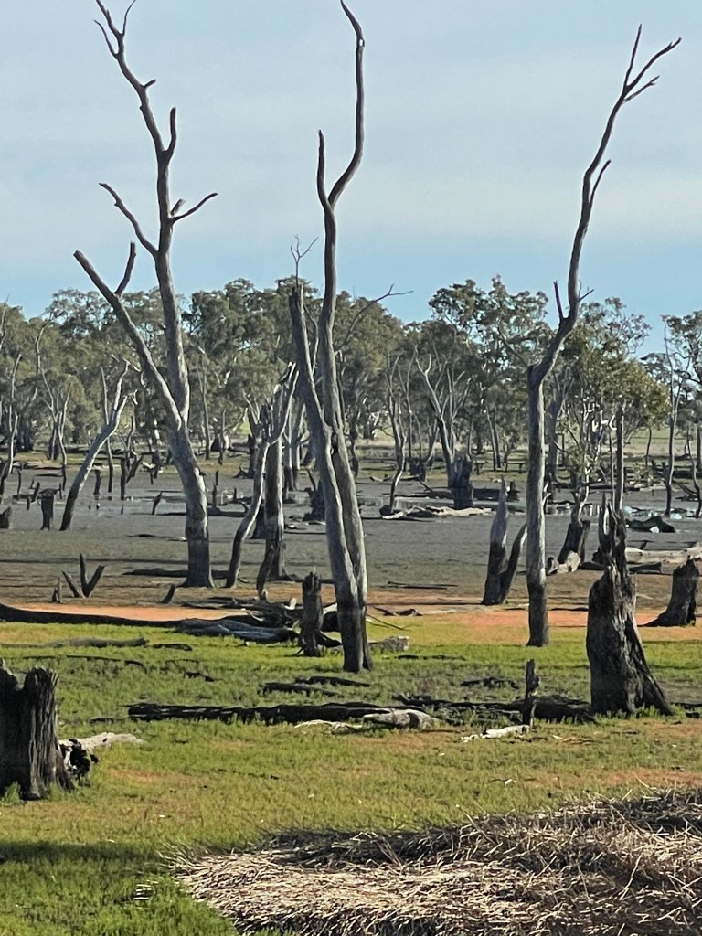 Walking the track around its edge and the many black marks at the trunk bases suggest water has been much deeper in the past. It reminds me of the Wimmera Mallee reservoirs whose water levels also change – with weirs, droughts and new pipelines – rather than run-aways.