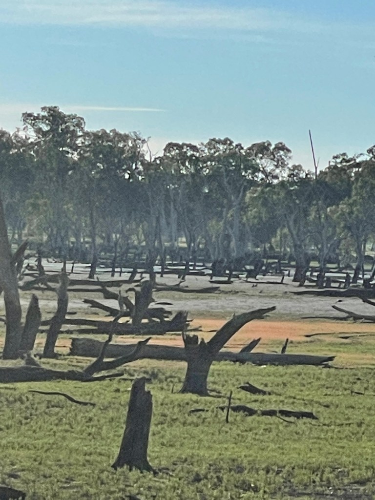 It is nice to see a series of skinny red gum saplings – maybe from a recent flood – which contrast positively with death and destruction in the centre.