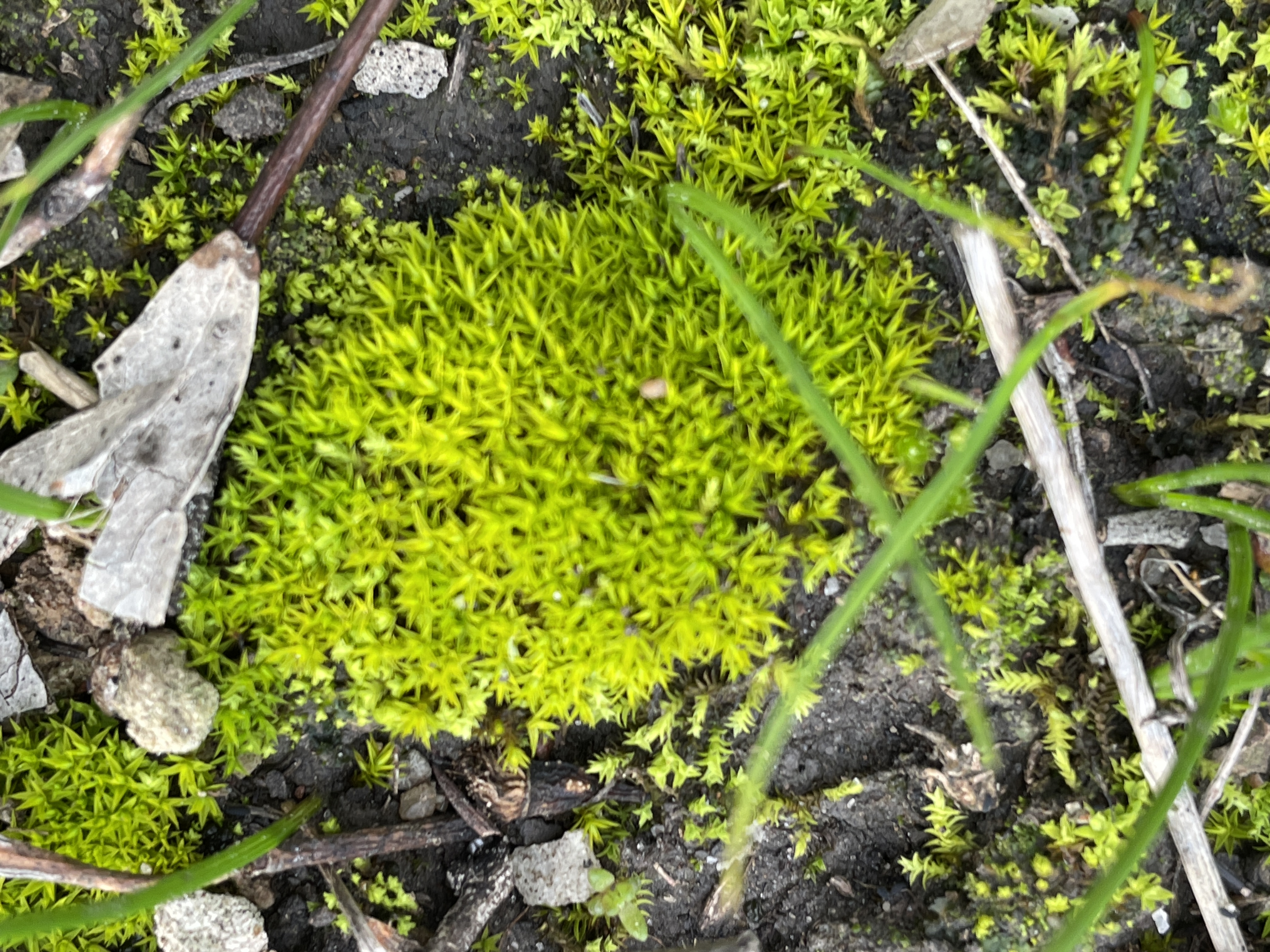 We turn south and we notice the huge chunks of lichen on trees that line the winding trail back towards the wetlands.