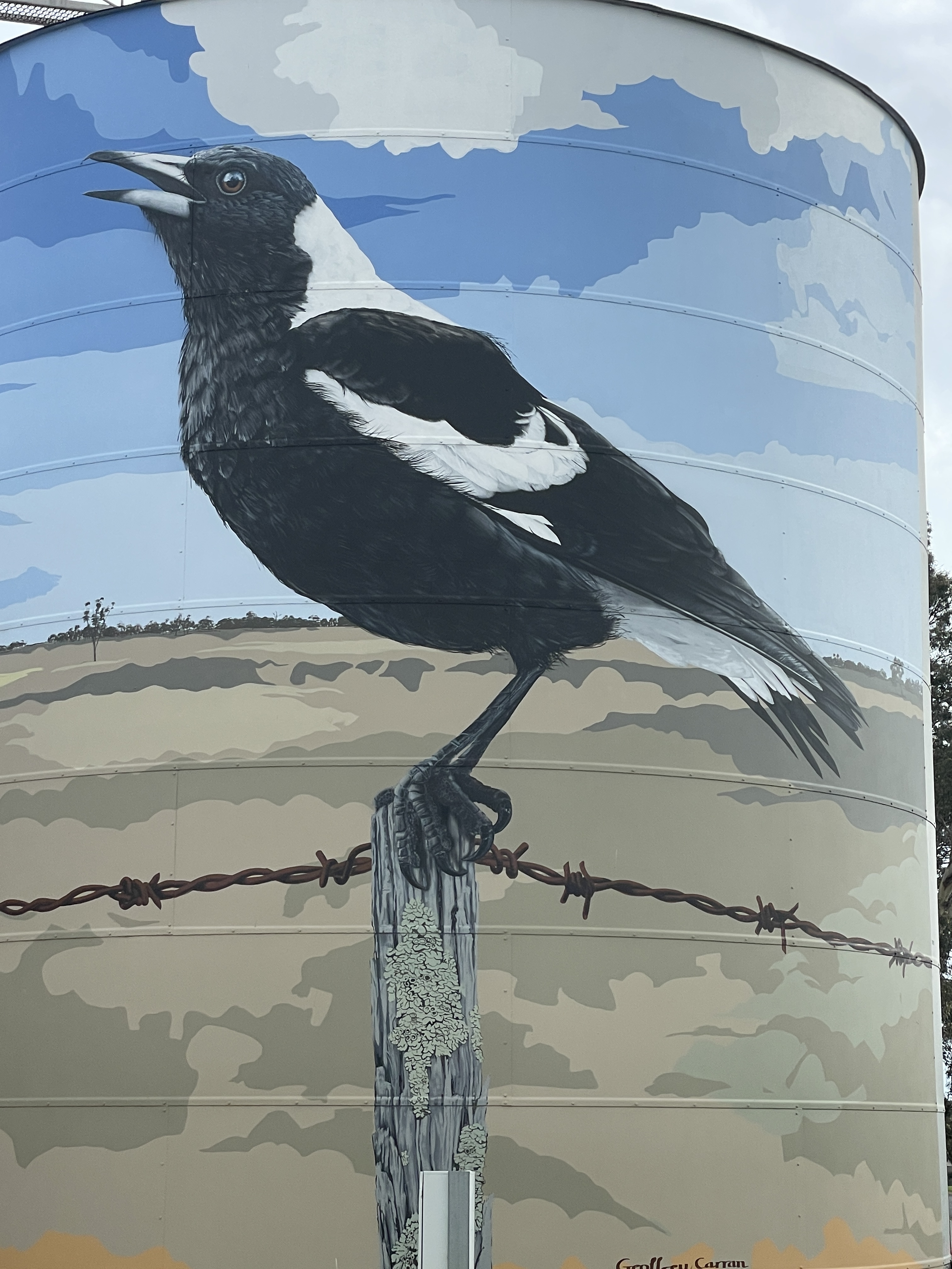 We take the 2km track back to the Goroke Harrow Road and head 10km north to Goroke – which some sources say is an Aboriginal word for Magpie – to see some more birds on the local silos.