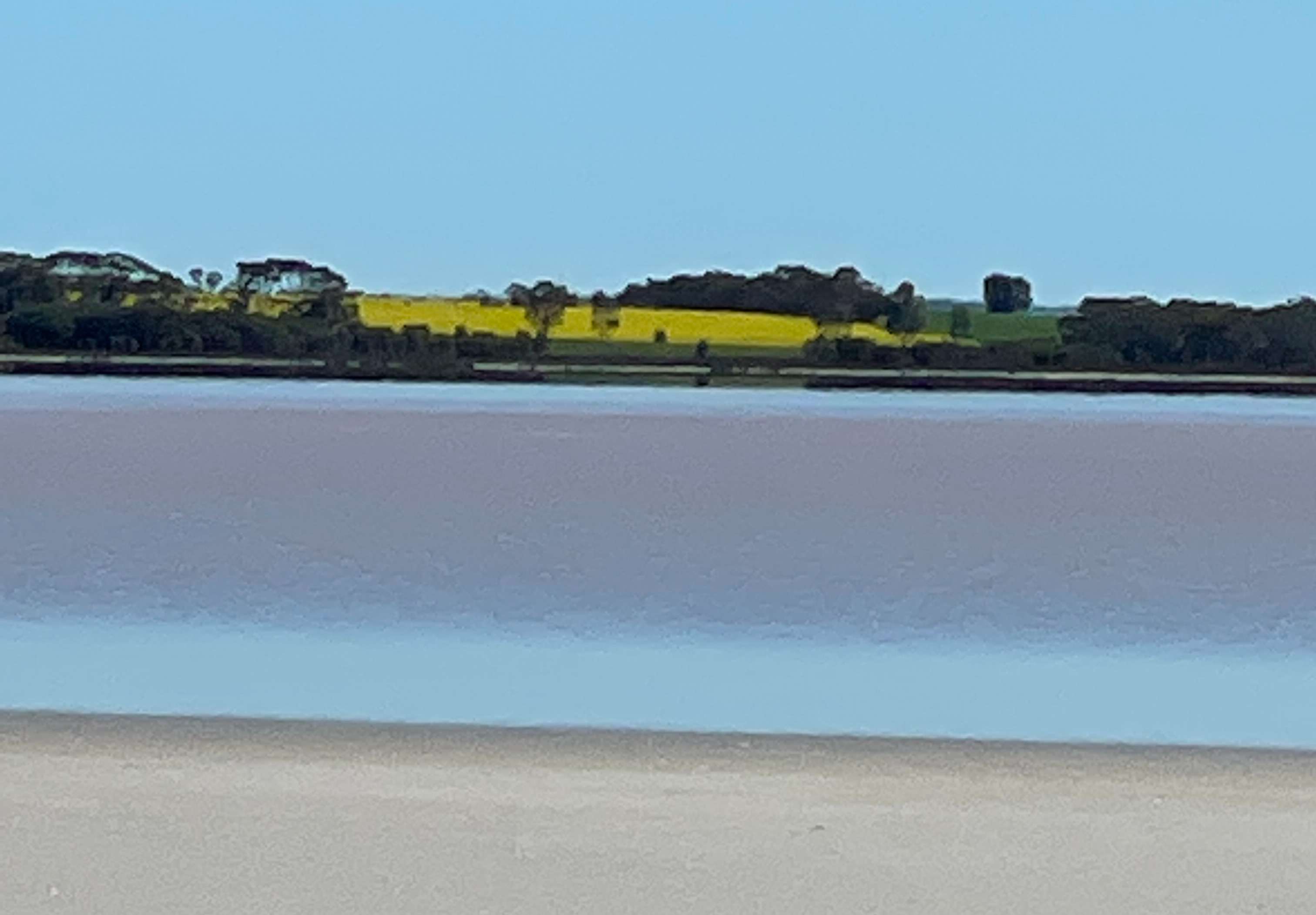 I see distant golden canola crops, the lines of different colours and textures between water, clay, hills and bush.