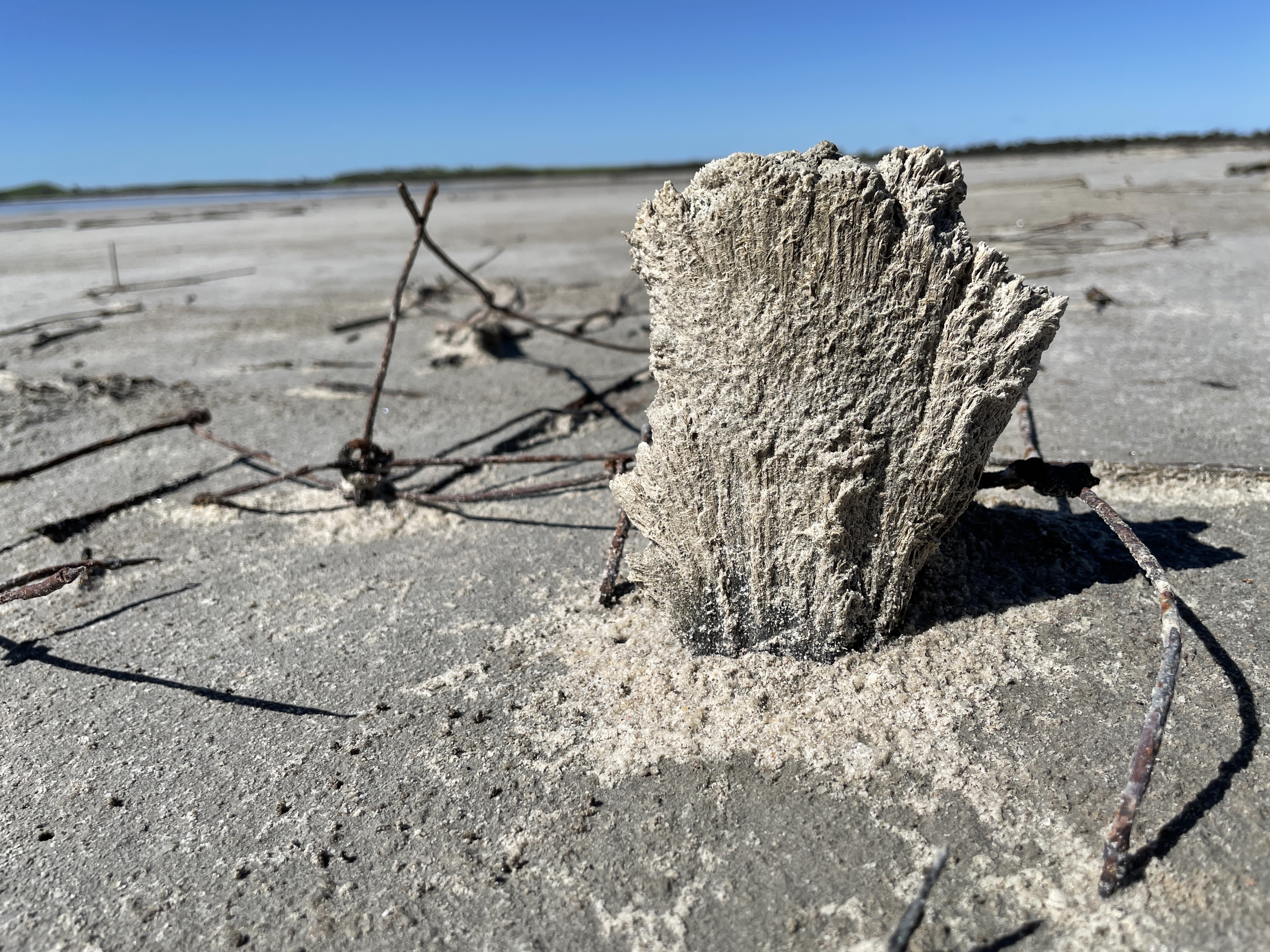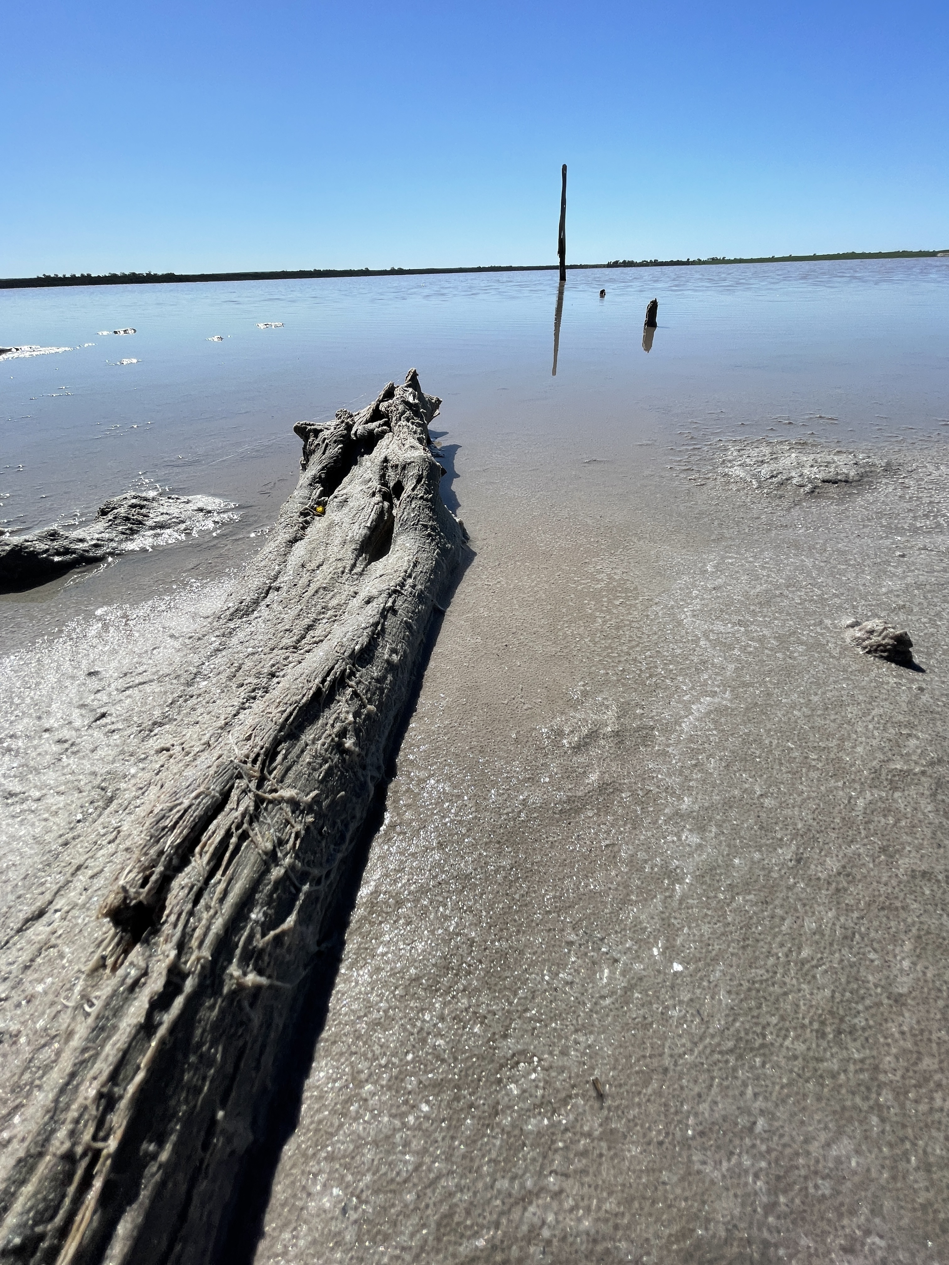 I head back to solid ground and notice that everything is preserved with salt, the half-buried blonde lumps of driftwood, crusty cracks on the drying bank, bones and the aged posts – weathered but upright thanks to the determined clay.