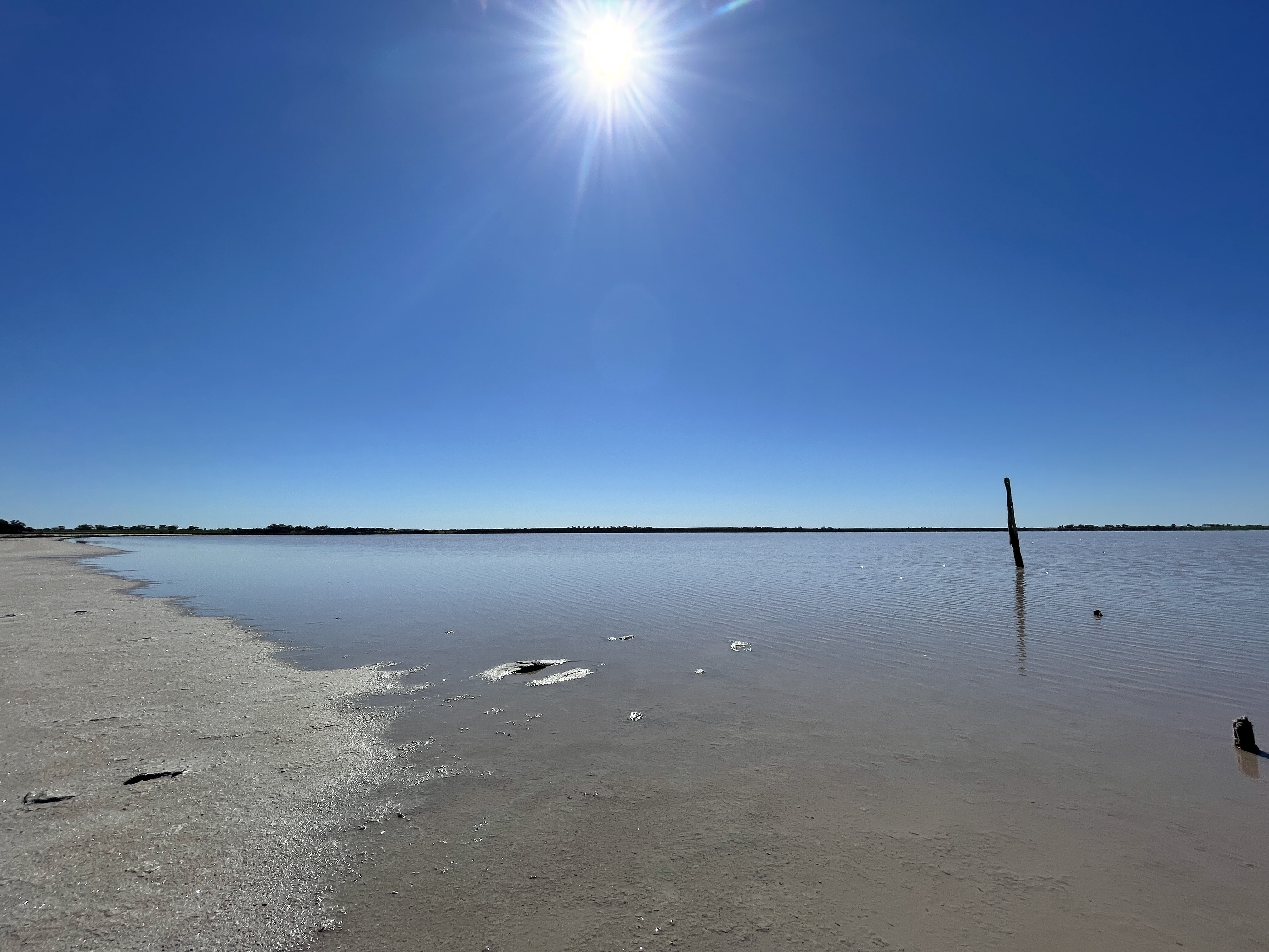 What I do see are the waves of salt on the shore. I see how salt makes the whole area sparkle when hit by the sun and how the sun just beams on the flat still lake.