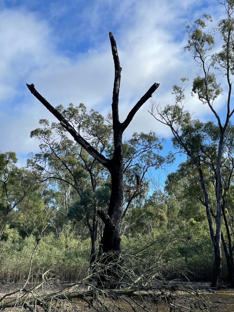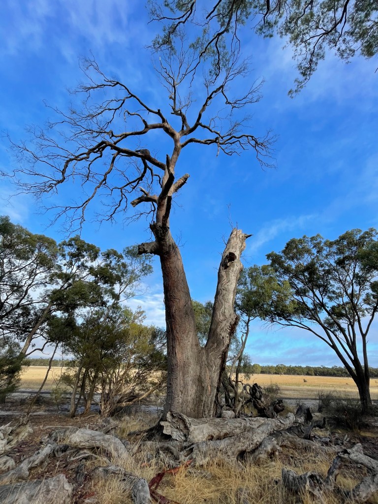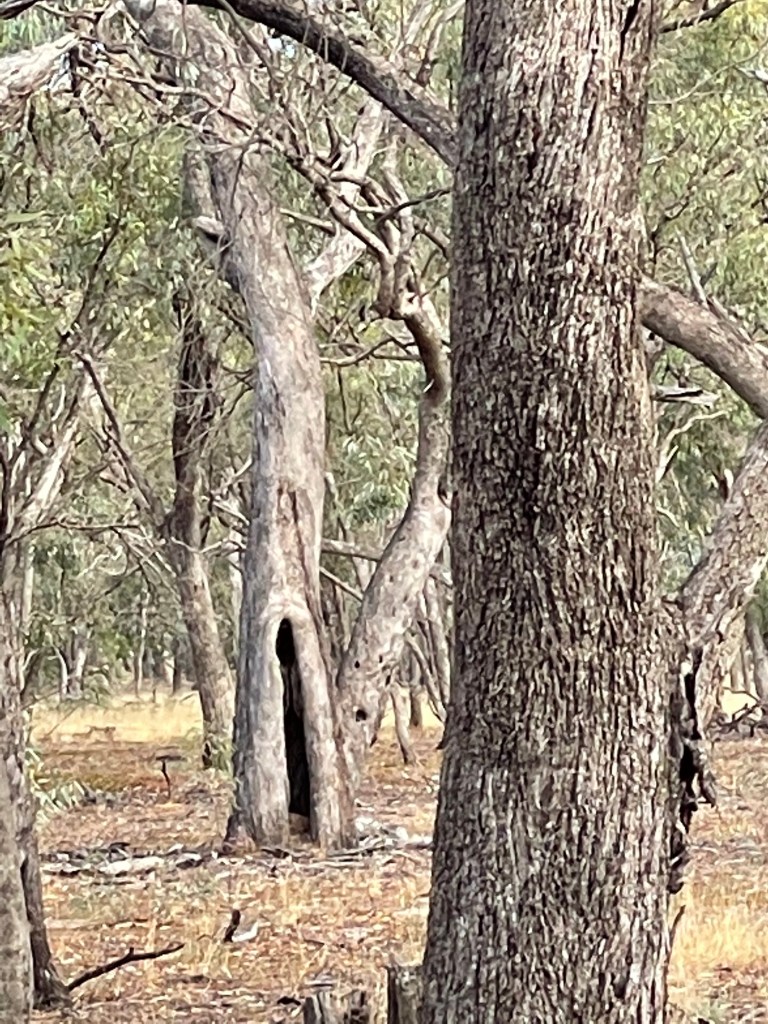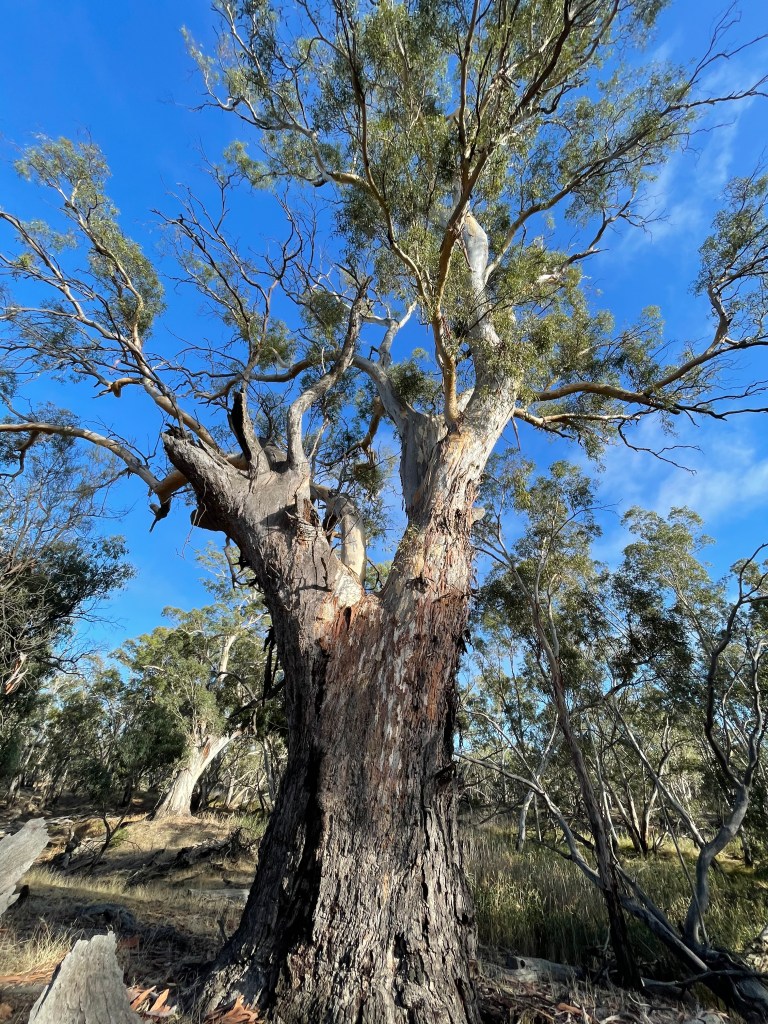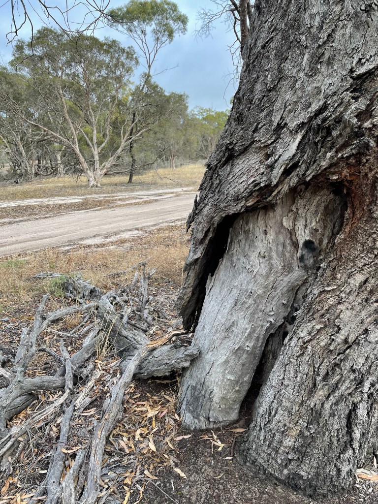I pass some veteran red gums including a burned hollow trunk which may have also been scarred by a human hand in a long distant past. It is right near a dry creek that feeds the swamp after a downpour.