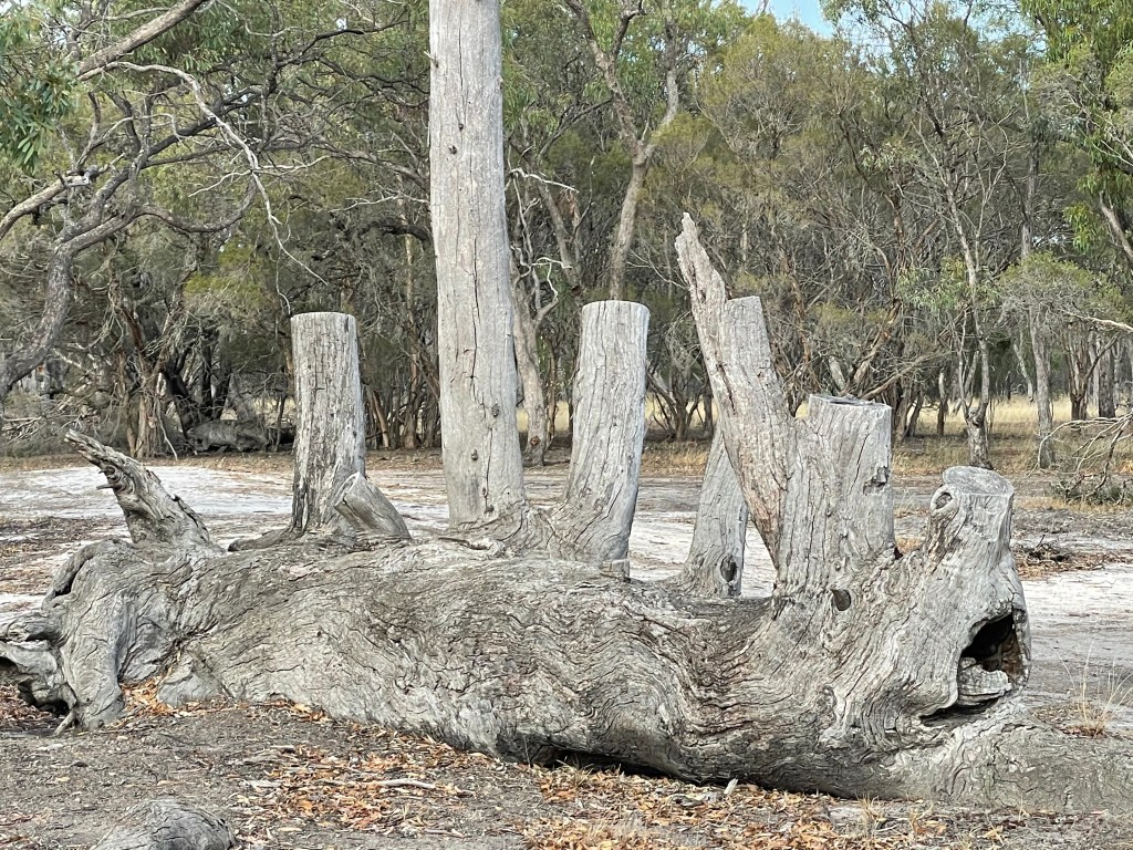 A feature of this basic camps site is an unusual dead tree. Lounging on its side it looks like it fell over many years ago and several new branches grew vertically from the trunk. Not a bunyip but a possibly a multi-armed trunk monster.