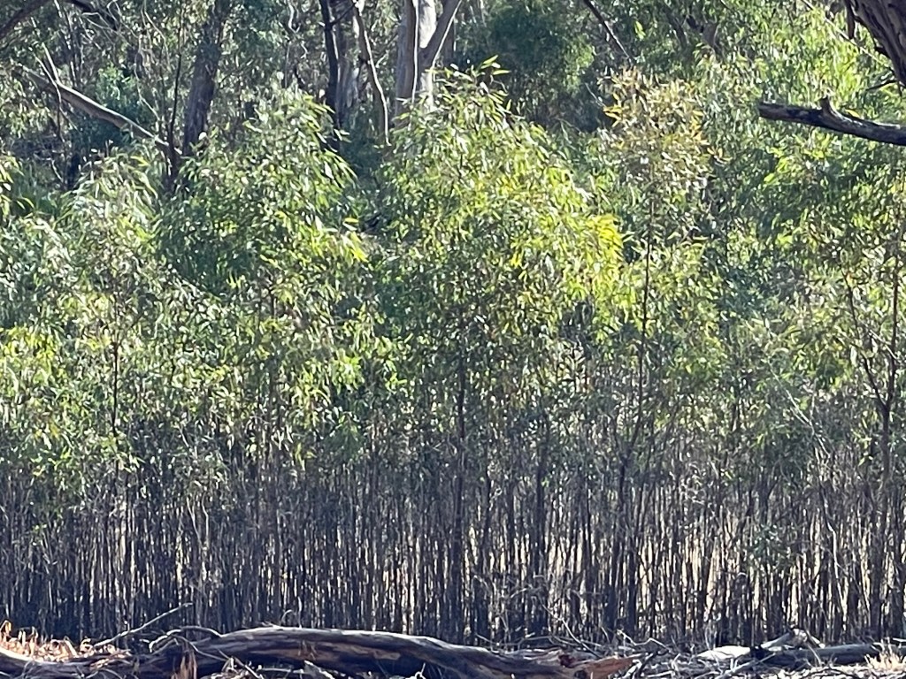 Lush clumps of eucalypt saplings are the progeny of recent floods and bare black trucks show this area has also been hit by fire.