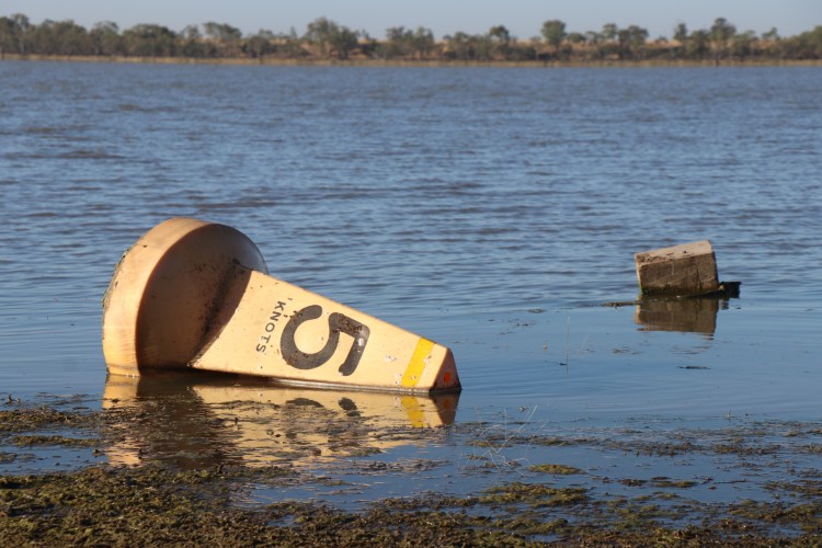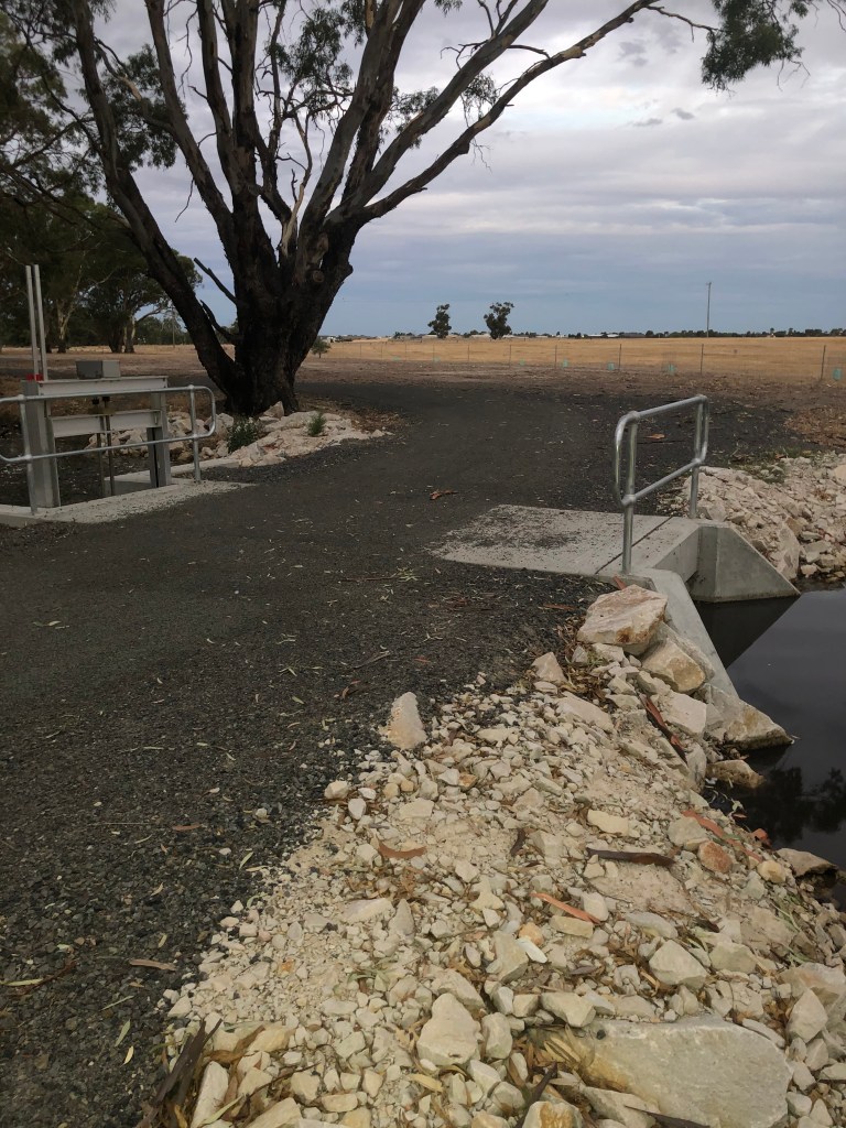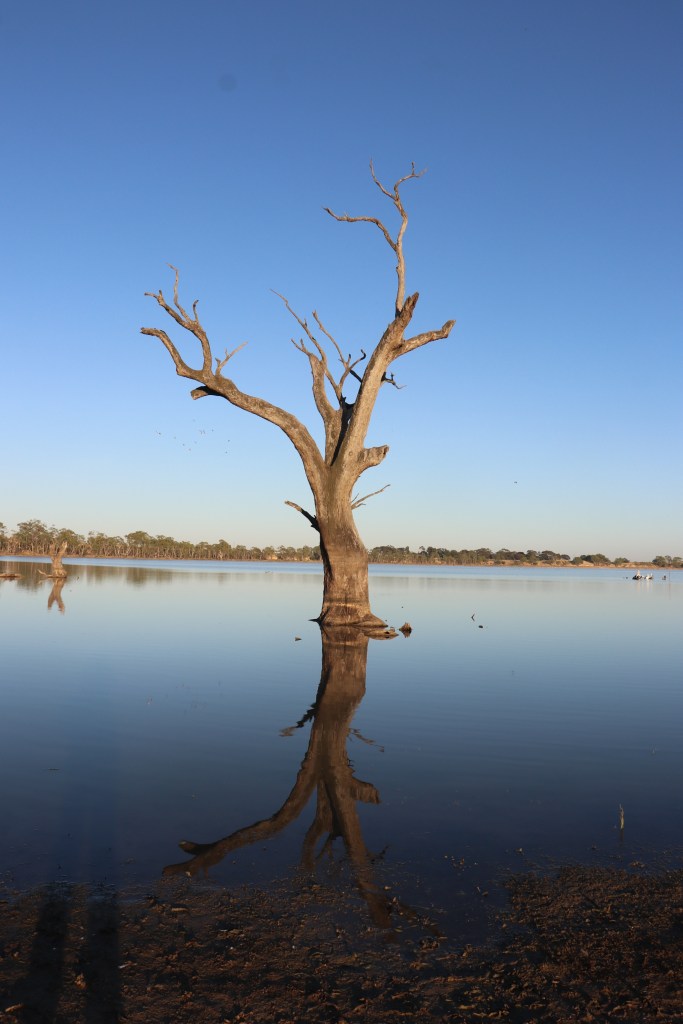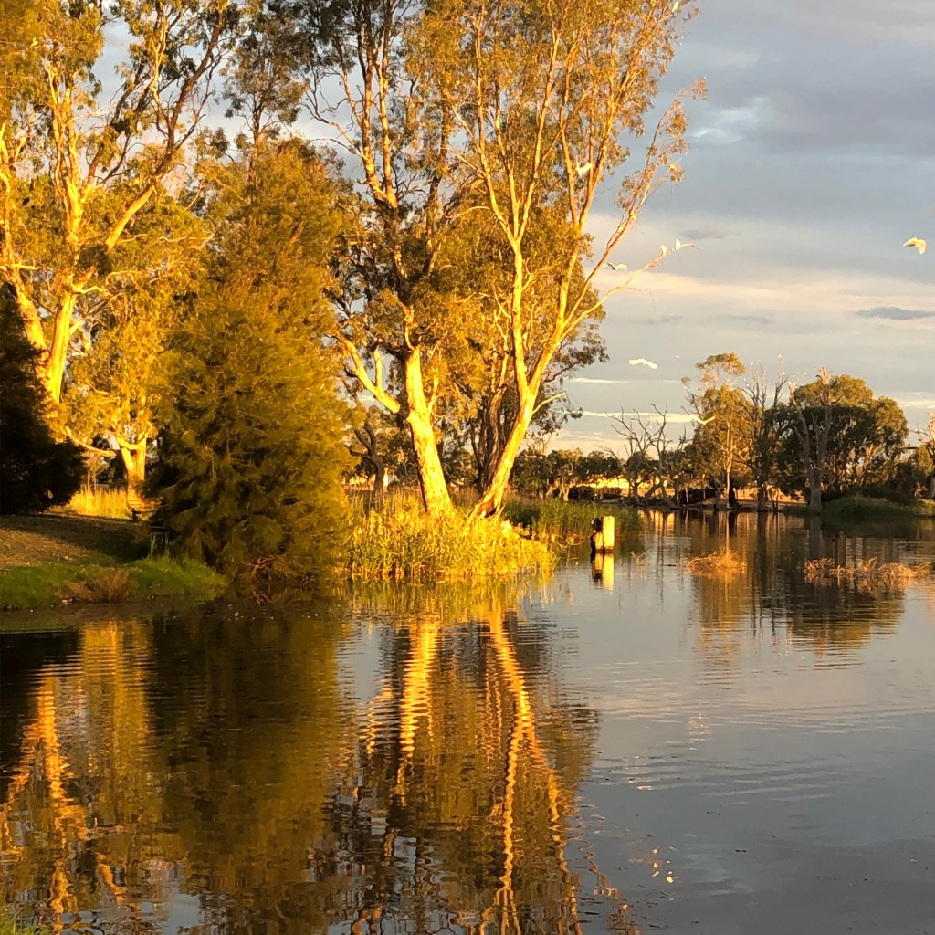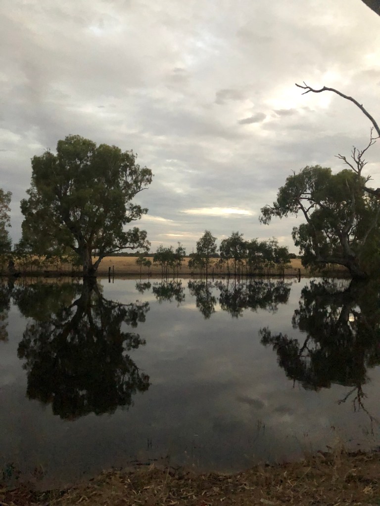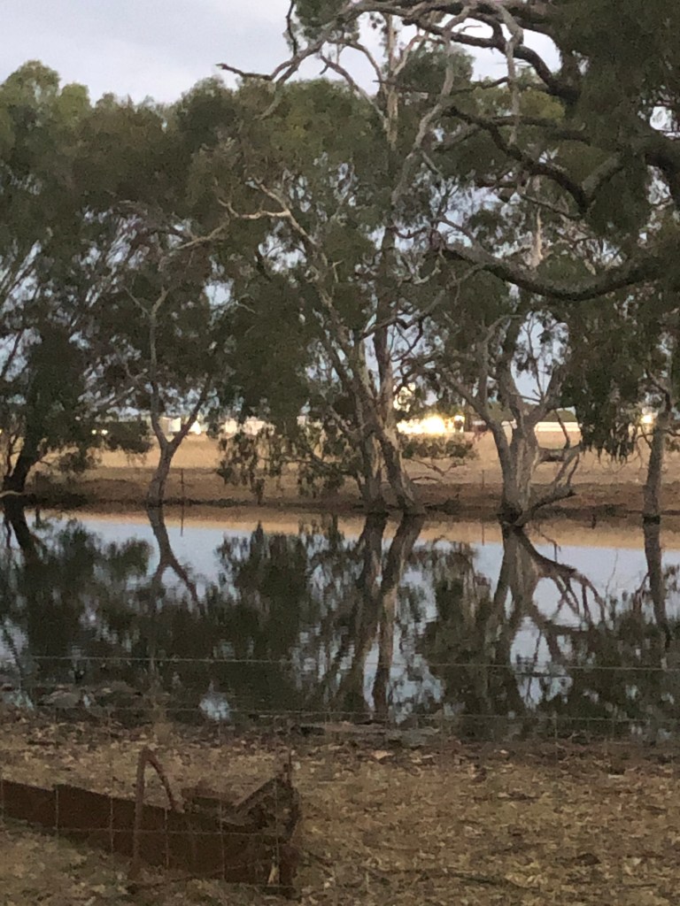 Then the landscape comes to life again. Tens of 1000s of big green trees on the left followed by well-irrigated Culluleraine sports grounds on the right. We turn left onto Lock 9 Road and head north through salt bush and dust to the Murray.